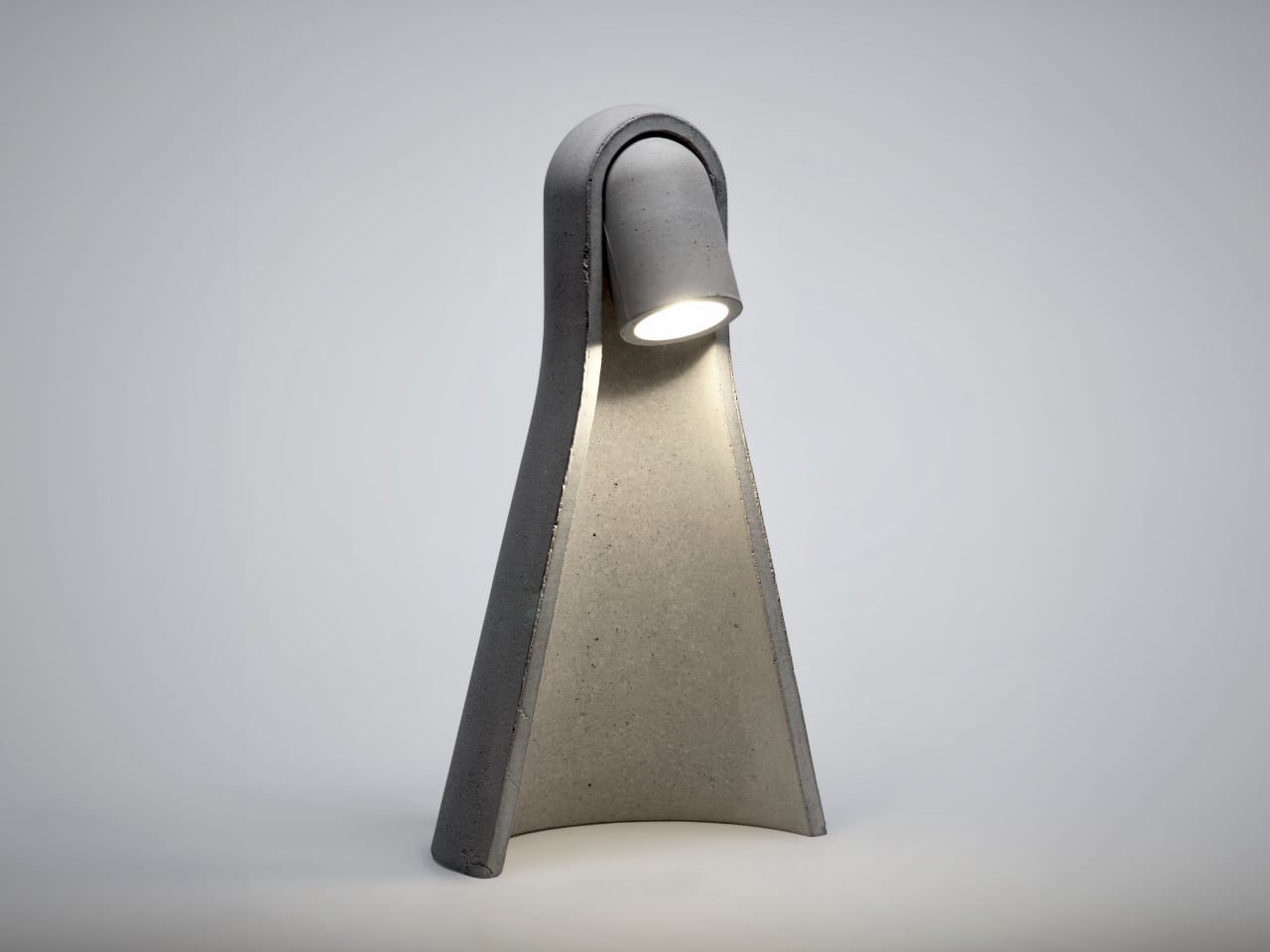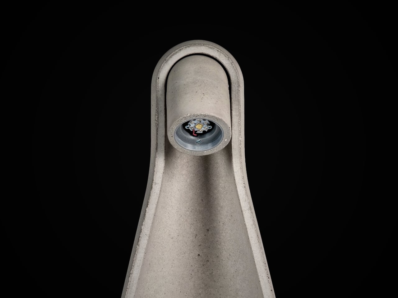 The form does most of the work. Surface transitions are controlled and gradual, edges are rounded rather than chamfered, and the overall proportions avoid the solid block feel that makes most concrete objects look like they belong on a construction site. The negative space inside the body carves away visual mass, helping the lamp feel lighter than any concrete object has a right to feel when you know how dense the material actually is.