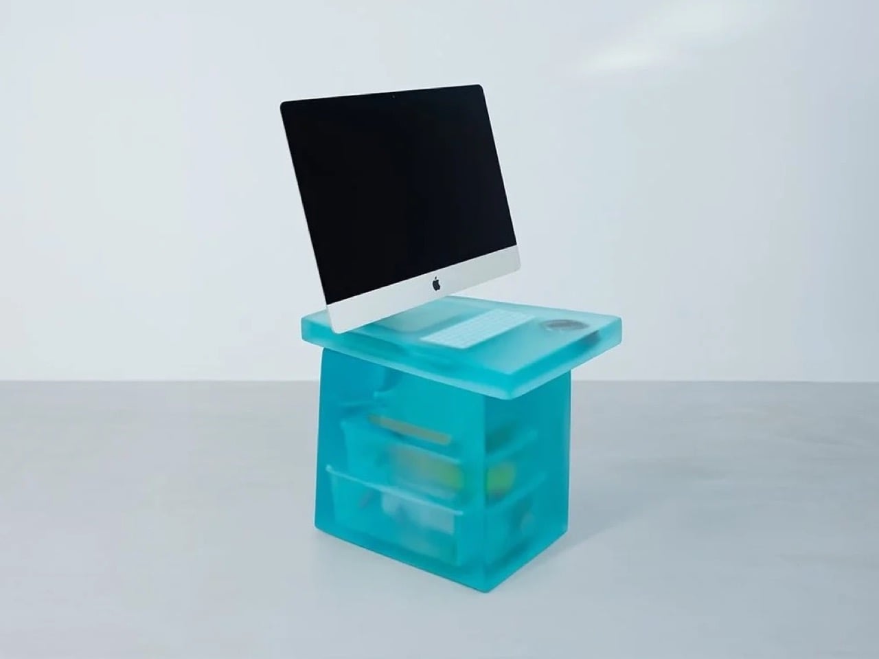 The resin block is where the craft gets interesting. Lim sealed a full Apple Magic Keyboard, a Magic Mouse, and a set of colored desktop storage bins inside the body of the chair. The bins are the kind that live on studio shelves holding batteries, USB cables, and every small object that never quite found a permanent home. Through the semi-translucent resin, their shapes read clearly near the seat surface and dissolve into soft blur toward the base. That gradient from legible to ghosted is the whole thesis of the piece made physical, and it required real material control to pull off at this scale.