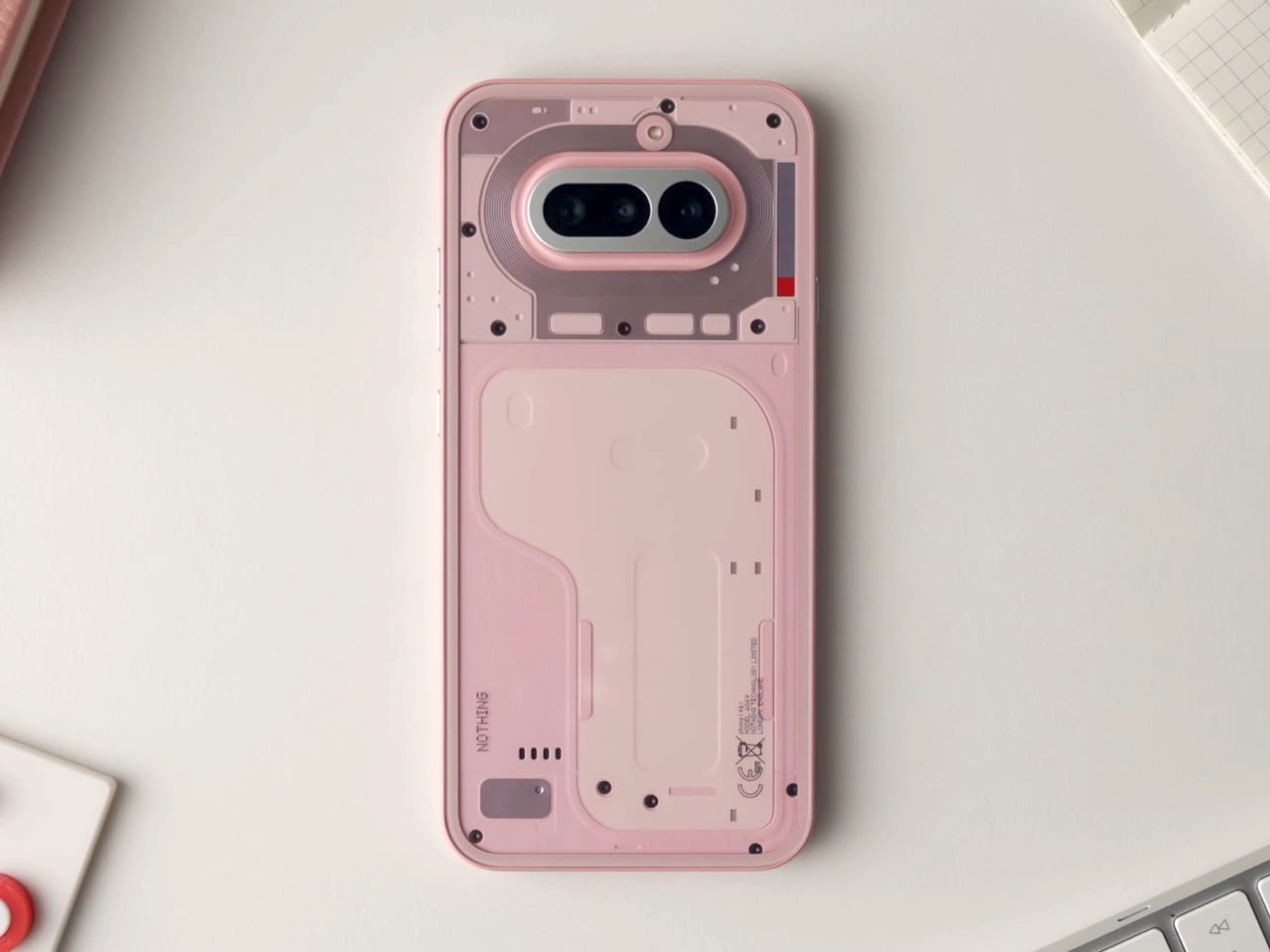 Apple has been doing a version of this for years. The iMac G3 in the late nineties used translucent colored plastic to create that same sense of depth, and modern iPhones apply color to the inside surface of the rear glass rather than painting the outside. It’s a technique with a real legacy, and Nothing’s designers actually had a pink iMac on their mood board. That’s worth knowing, because it reframes the colorway from trend-chasing to something with genuine design lineage. The difference is that Nothing puts the engineering on display underneath it, so the tinted glass is also a window into the hardware, which layers the effect further.