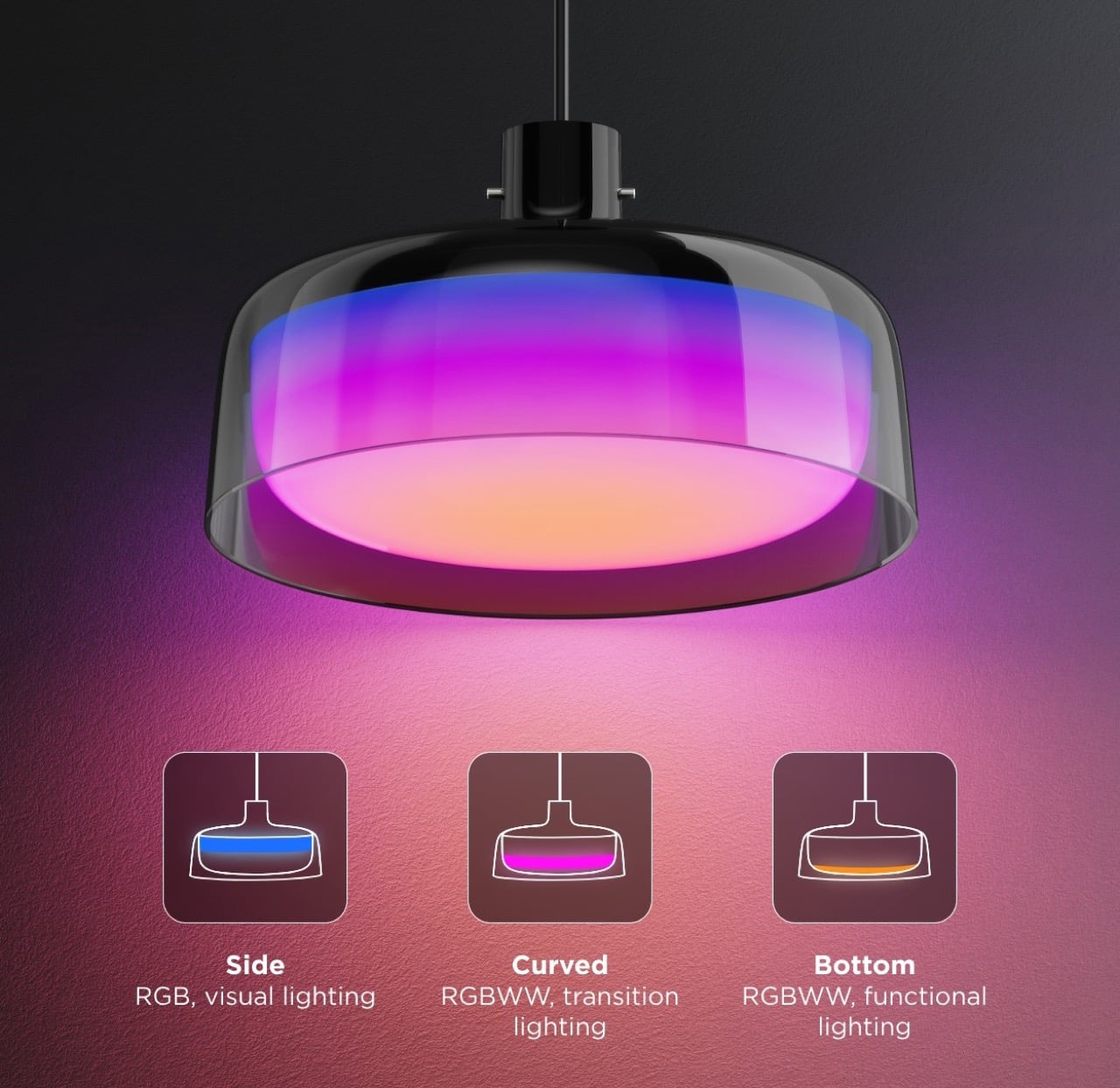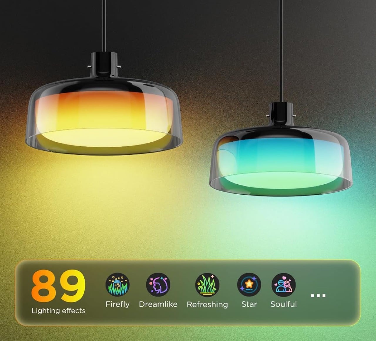 This one hangs from your ceiling like it always belonged there, a wide smoked-glass drum shade with the confident silhouette of a proper design fixture. Nothing about the exterior screams smart home gadget. And then you turn it on, and the whole thing comes alive in layers. RGB color pulses along the sides. A warm RGBWW gradient bleeds across the curved interior. Clean white light floods down from the bottom panel for actual task lighting. Three zones, one fixture, and a Govee app full of presets that range from “cozy Sunday breakfast” to “we are absolutely having a party in this kitchen.”