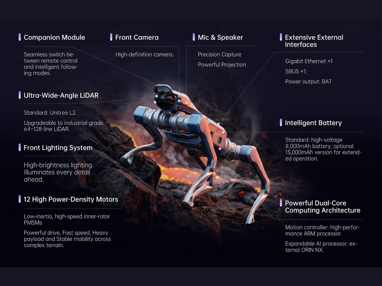The platform is also open, which matters more than it might seem. The As2 supports large AI models for what Unitree calls “embodied AI interaction,” essentially giving developers the tools to build autonomous behavior on top of the hardware. The EDU model can even be expanded with an NVIDIA Jetson Orin NX, which opens the door to more complex AI applications. GPS and 4G are built in, though disabled by default. It runs on an 8-core CPU and comes in three configurations, AIR, PRO, and EDU, each scaled for different use cases from general exploration to full industrial deployment.