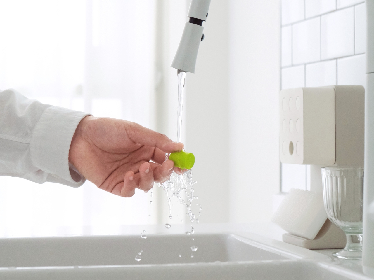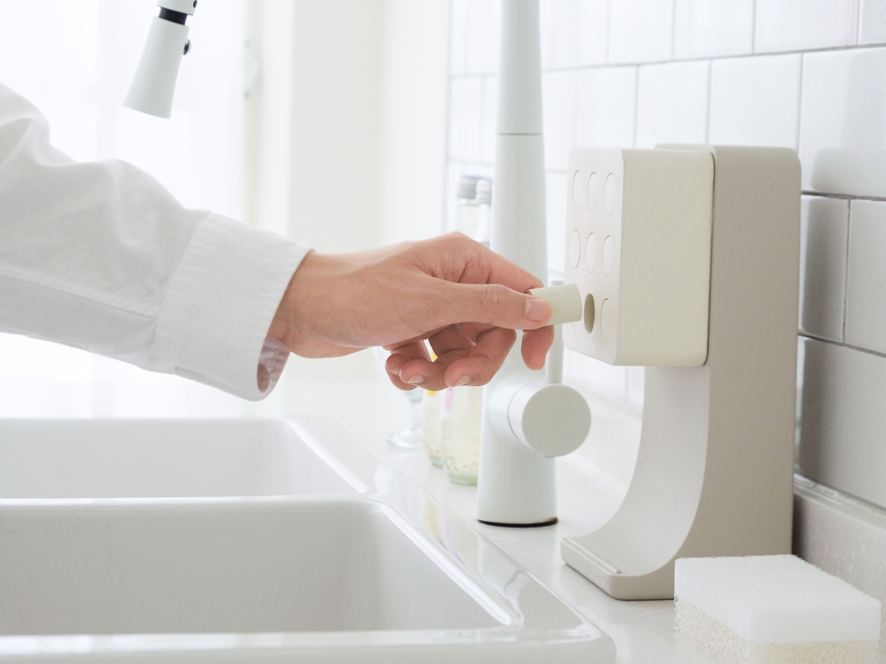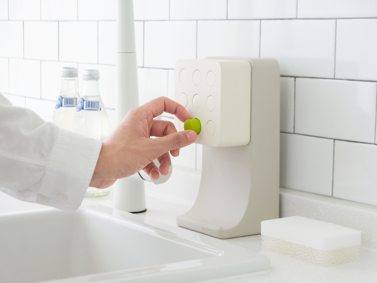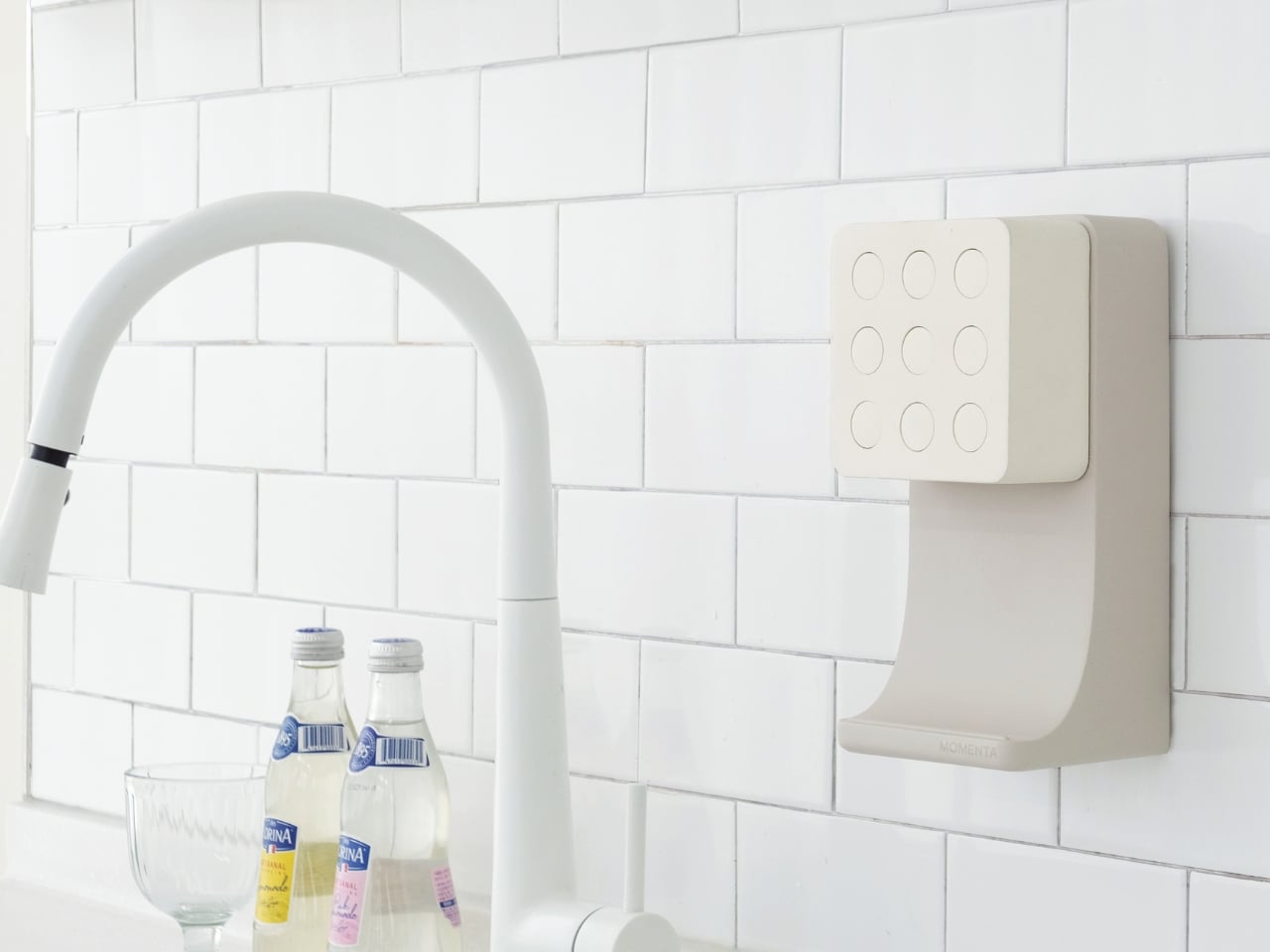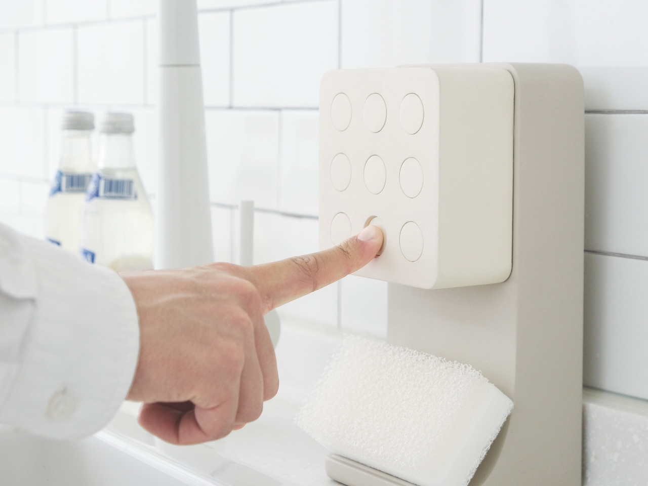 The detergent dispenser might be the most playful piece of the three. Nine small circular triggers sit in a grid on the face of the unit. When it’s time to do the dishes, one of them changes color. To reset it, you rinse it under water, which gets your hands wet, which is basically half the battle when it comes to starting the dishes. Once the trigger is placed back into its slot, detergent dispenses automatically. The whole sequence is almost gamified, and that feels intentional.