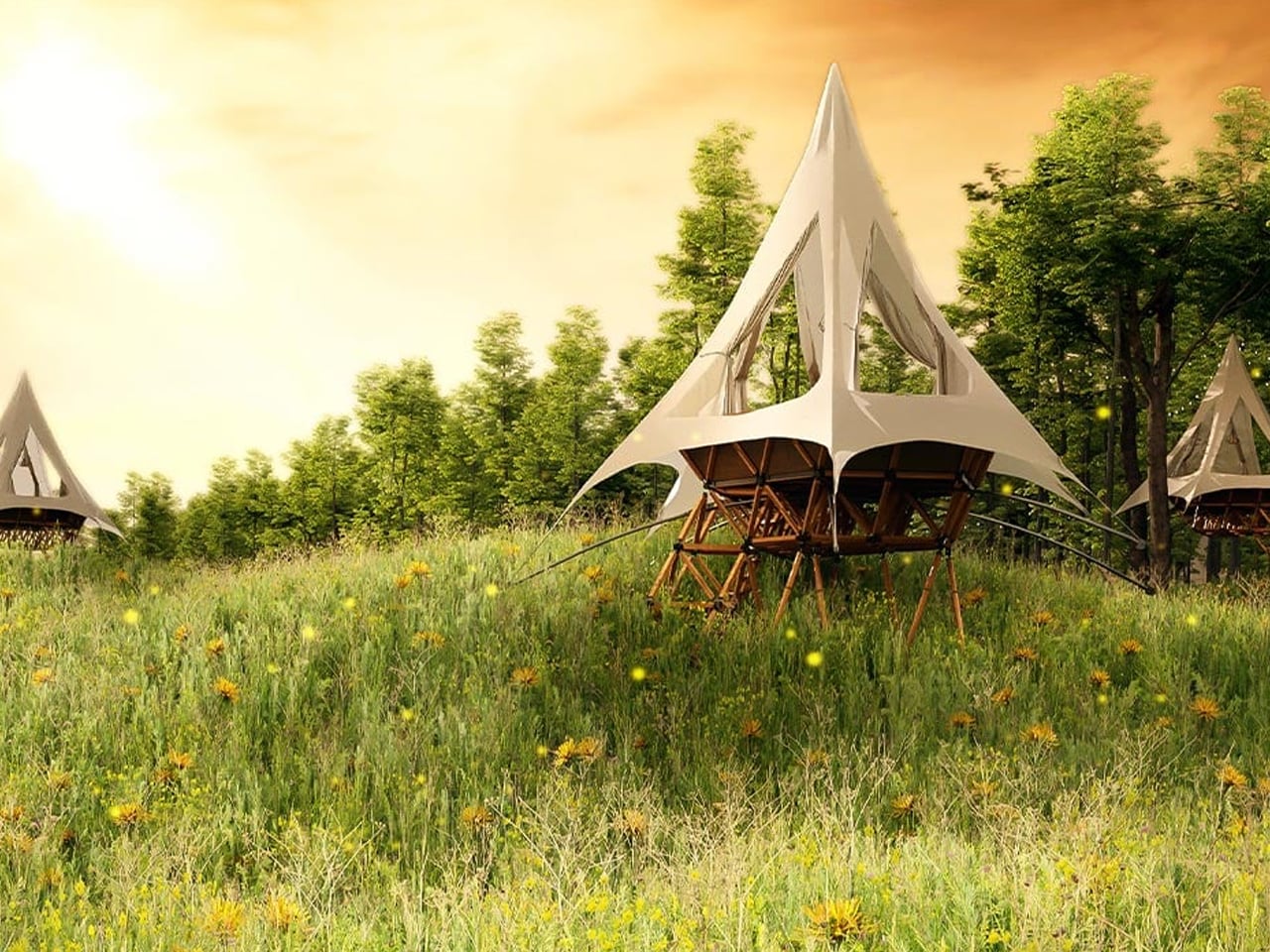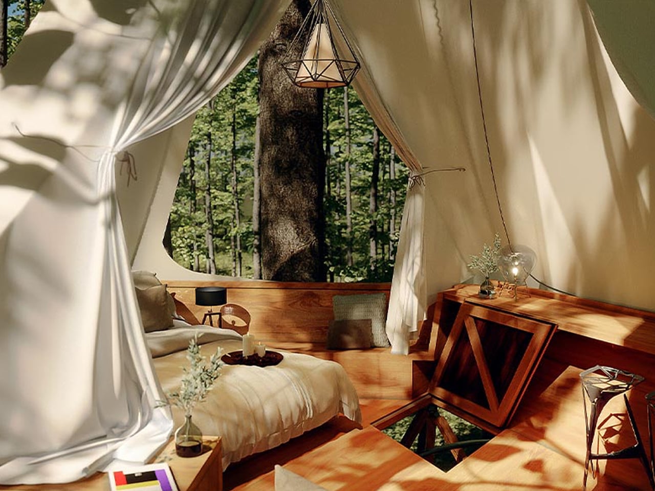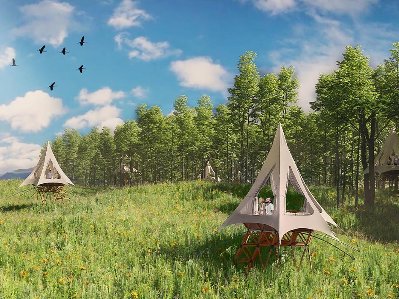 What makes these homes especially compelling is their modular, lattice-based construction, which allows multiple units to connect and evolve into small, customisable clusters. You can adapt layouts, shapes, and interior details to suit how you live, work, or unwind, while enjoying warm, wood-toned interiors, generous natural light, and breathable canvas roofing. From iconic A-frame forms to dome-like shelters, each structure balances architectural innovation with the simple comfort of being tucked into the trees.