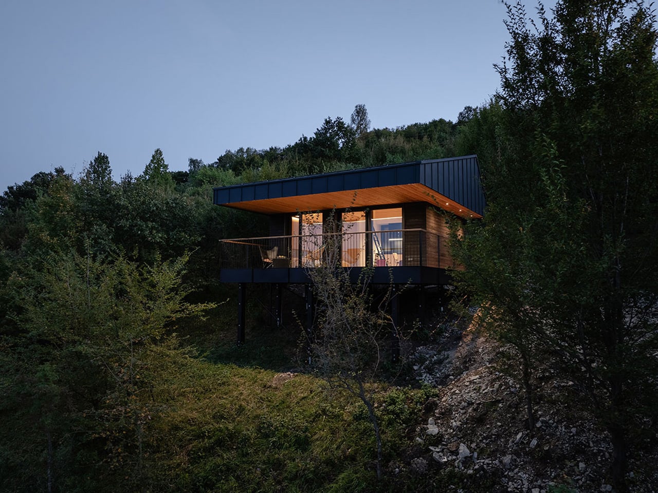 Set within the wooded hills of Dunabogdány, Hungary, Console House by Hello Wood is a quiet retreat overlooking the Danube Bend. Designed to sit lightly within the landscape, the minimalist home follows a calm, nature-first approach, allowing the forest to remain the main visual focus. Raised on slender stilts, the structure appears to float above the ground, preserving natural water flow and wildlife movement beneath. Large glass openings frame peaceful valley views while filling the interiors with soft daylight.