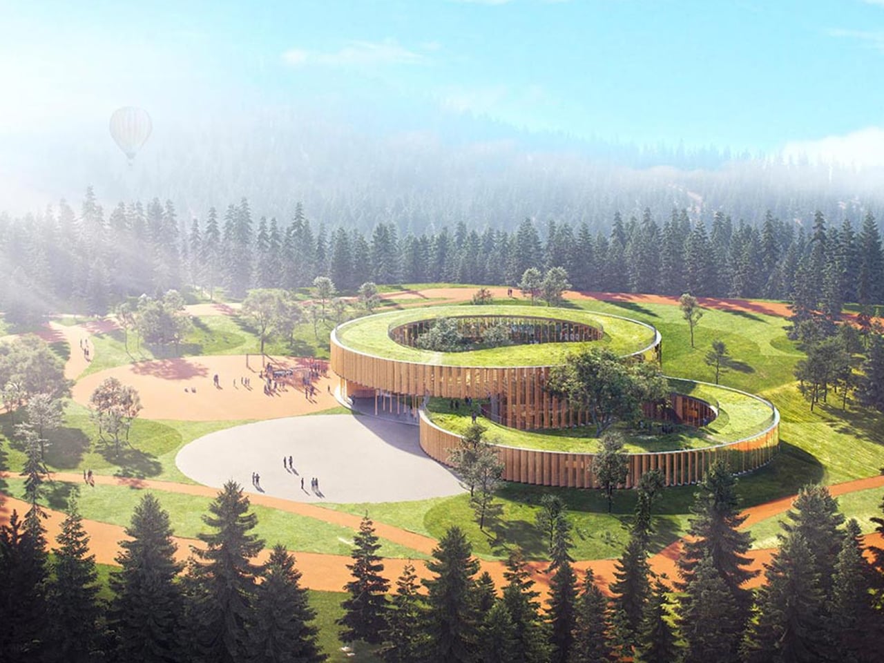 At the core of the design are two large, interconnected rings that organize classrooms from kindergarten through secondary levels, each accommodating up to 25 students and opening toward the surrounding greenery. The circular layout forms sheltered courtyards and a usable rooftop for group activities, while faceted façades alternate timber panels and glass to manage sun exposure, encourage cross-ventilation, and maintain stable interior temperatures. These passive climate-control features reduce reliance on mechanical systems, keeping classrooms bright, airy, and naturally regulated throughout the day.