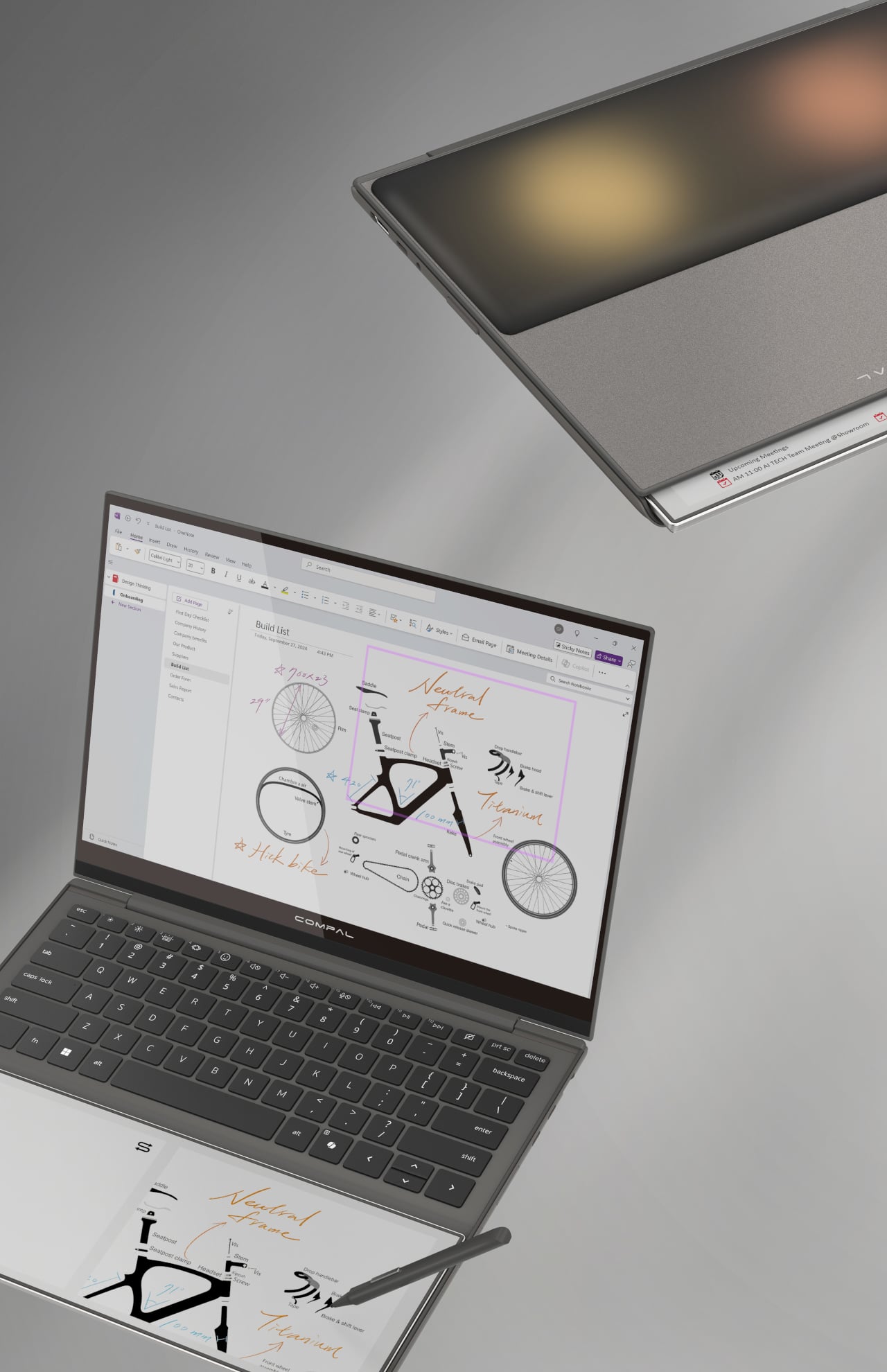 The concept goes further than a fixed notepad. The E Ink panel has a hinge, allowing it to flip outward when the laptop is closed so it faces up rather than folding in against the keyboard. In that position, it can show notifications, calendar entries, or a stylus sketch without requiring the lid to open. A narrow strip of the panel also stays visible even before flipping, offering a passive, glanceable information band that doesn’t ask anything of the user.