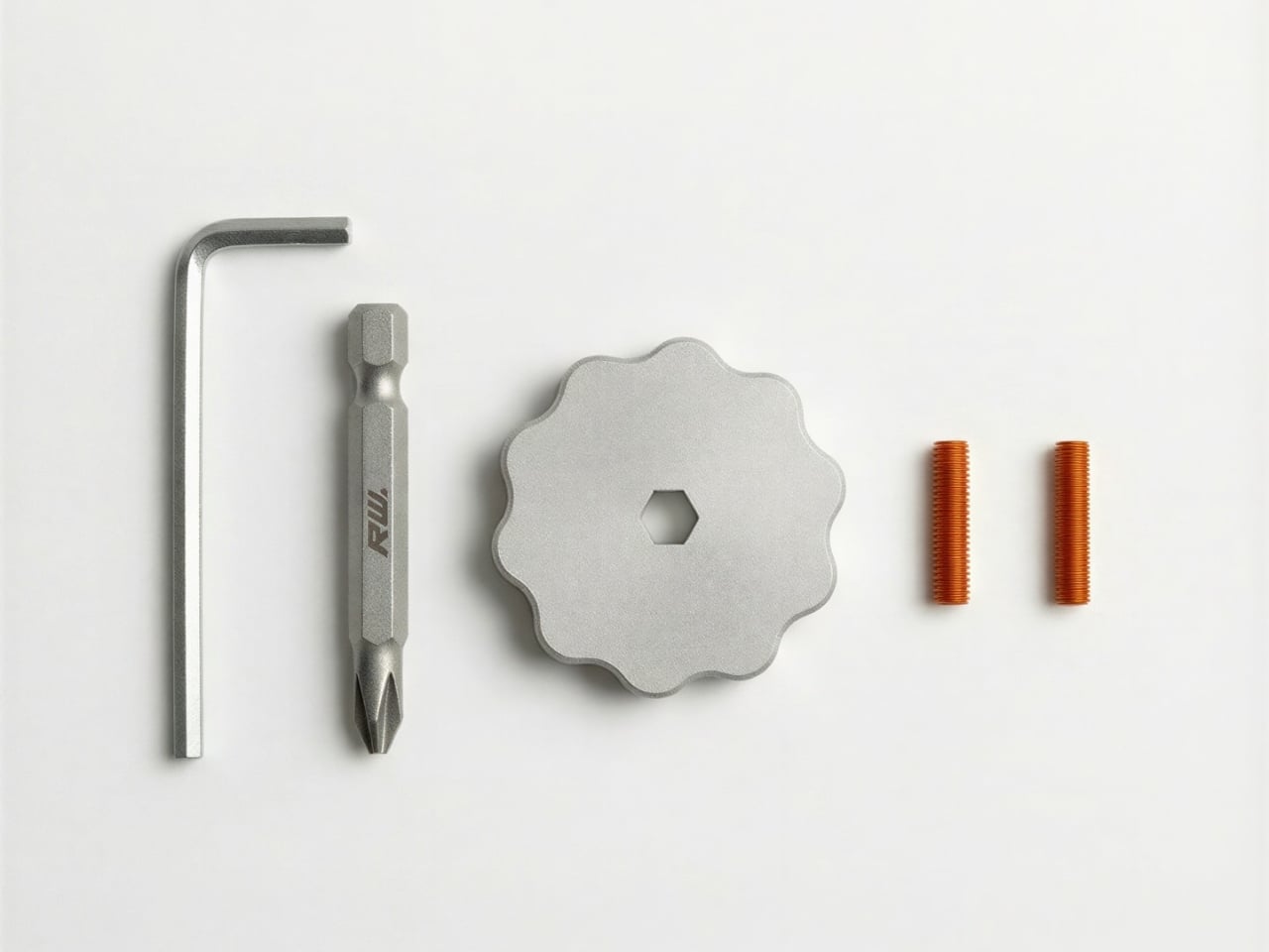 The Drillbit Gyro walks into that room and does something different. It takes a standard 1/4-inch hex bit, a flower-shaped body machined from what appears to be stainless steel, and two small orange threaded grub screws that lock the bit in place. An Allen key is included to tighten everything down. That’s it. The bit slides through the center of the body, with the Phillips head poking out the bottom and the hex shank rising up top, and what you get is a perfectly weighted little top that also happens to be a functional screwdriver. You grip the hex shank between your fingers, give it a spin, and it goes.