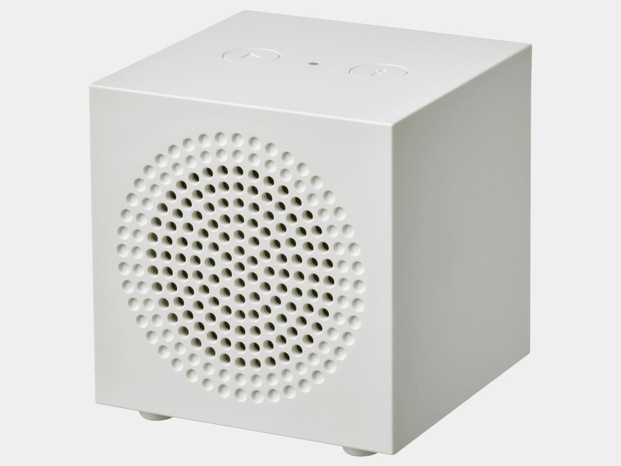 That framing matters. Most portable speakers broadcast what they are through a certain vocabulary: rubberized grilles, cylindrical barrels, carabiner clips, the unspoken suggestion that they’ve survived a kayaking trip. The KALLSUP makes none of those promises. Its face carries a circular grid of perforations, two buttons sit on top flanking a small LED, and the back has a USB-C port for charging. Nothing announces itself as a feature. It just exists, neatly, without fuss.