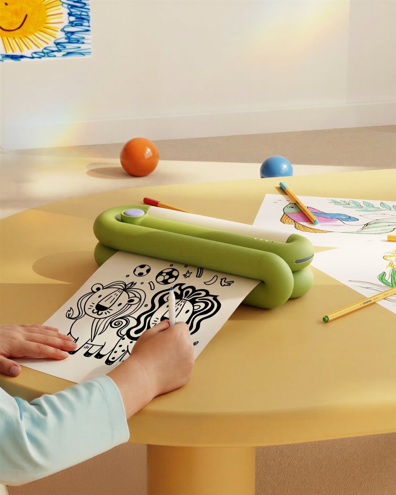 Create is a physical device, soft and rounded and painted in a cheerful lime green, that sits on a table and listens to a child speak. The kid says something like “a lion playing football,” Create generates a line drawing based on that prompt, and then prints it out on paper. Real paper. The kind you color in with markers and hang on the fridge.