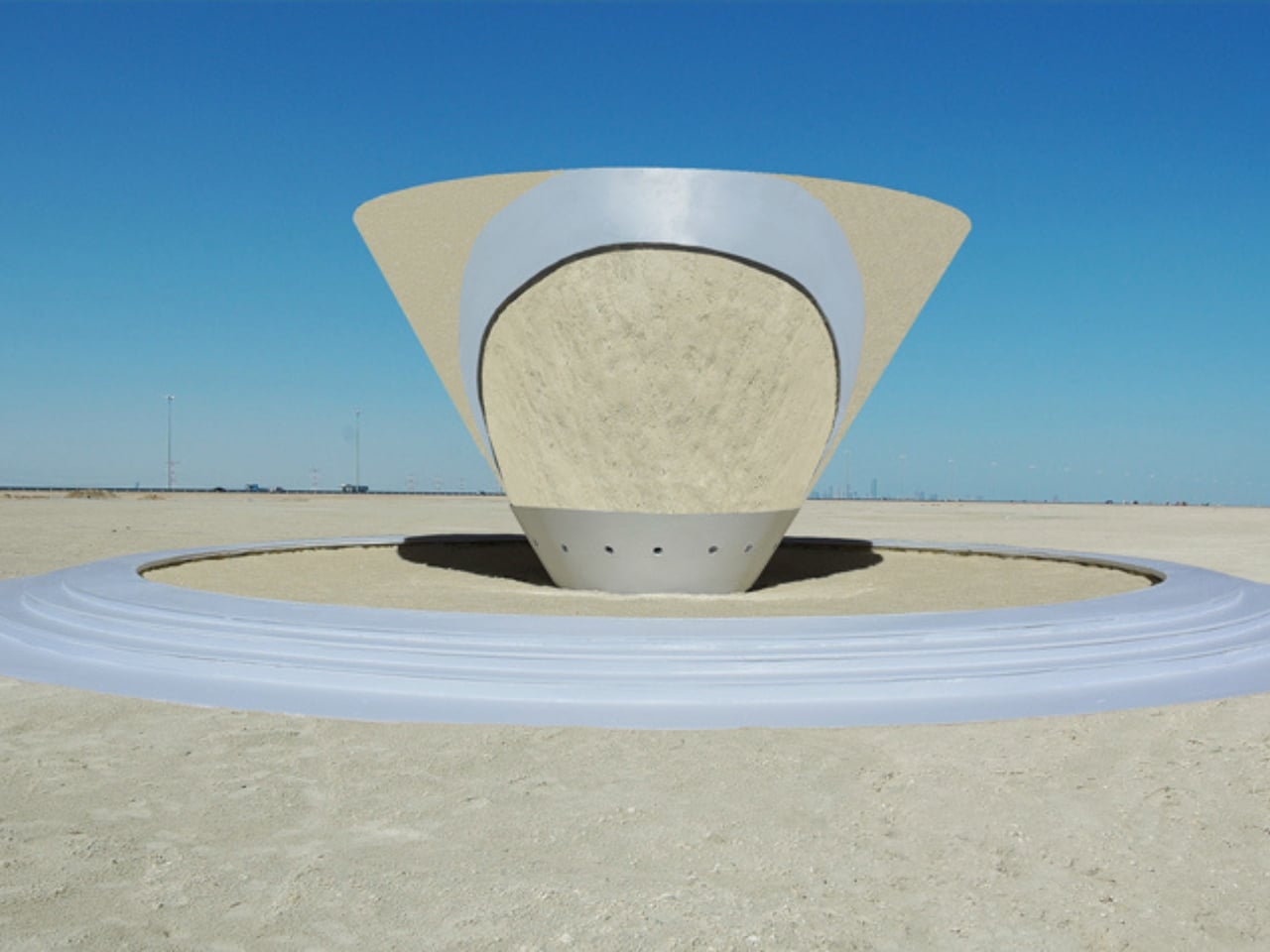 I also appreciate that this is designed specifically for desert landscapes, not dropped into them as an afterthought. The sand inside the ring is refined, but the material itself belongs to the environment. The installation doesn’t fight its surroundings. It borrows from them. The concrete base anchors the piece physically, but the sand connects it to everything beyond the circle’s edge. It feels like a conversation between the built and the natural, which is something Jantzen has been exploring for years across his various pavilion and shelter concepts.