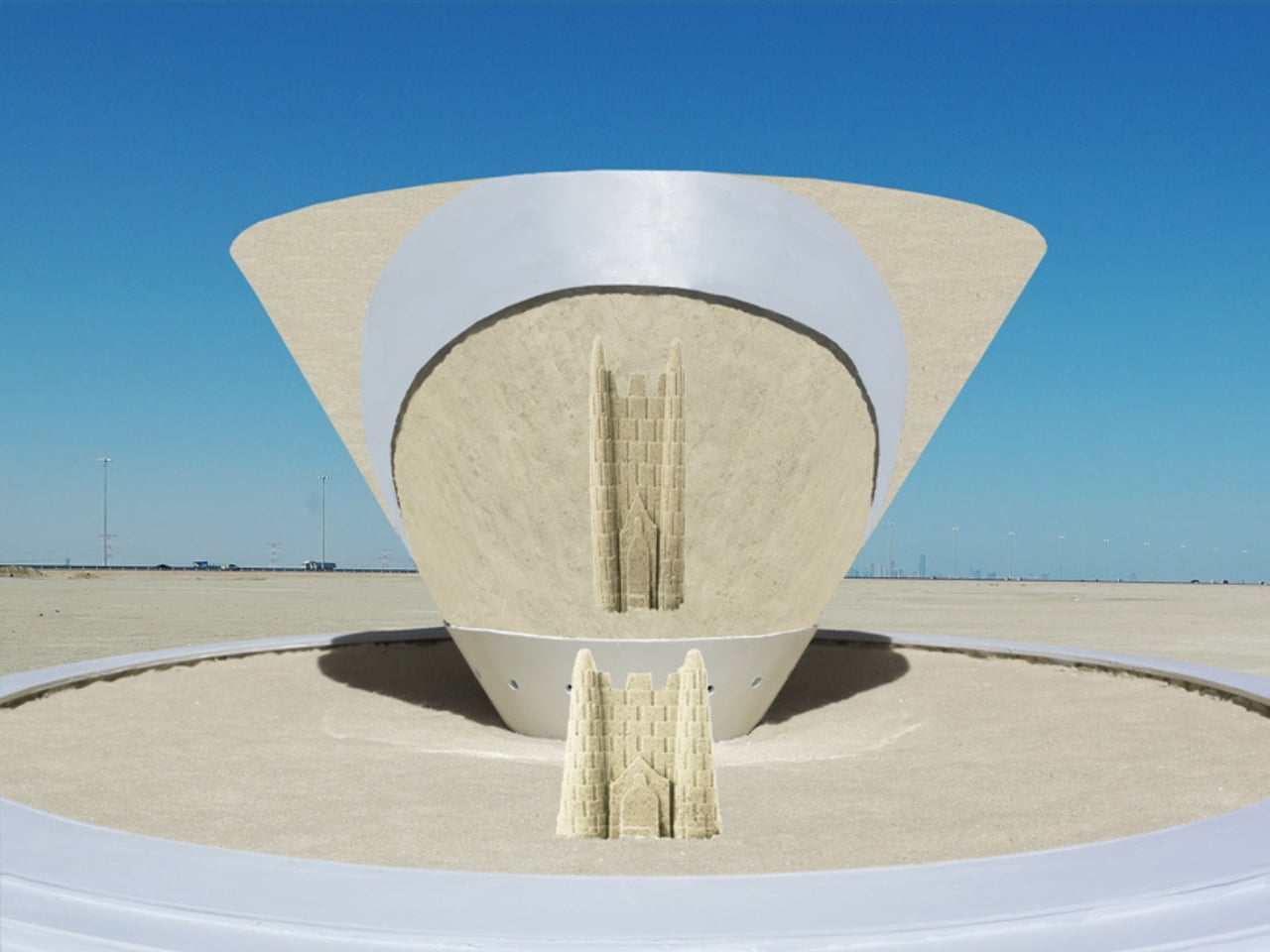 The solar-powered lighting is a nice touch, too. During the day, the polished steel catches sunlight and throws it around in dramatic ways. At night, the embedded lights in the concrete base take over, illuminating the sand and the cone from below. The piece transforms depending on when you visit. A daytime experience full of glare and sharp reflections becomes something softer and more atmospheric after dark. That duality gives the installation a longer life cycle than most public art pieces, which tend to lose their impact once the sun goes down.