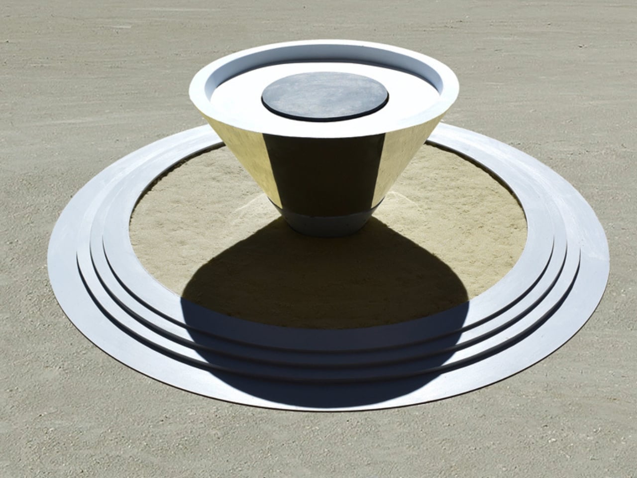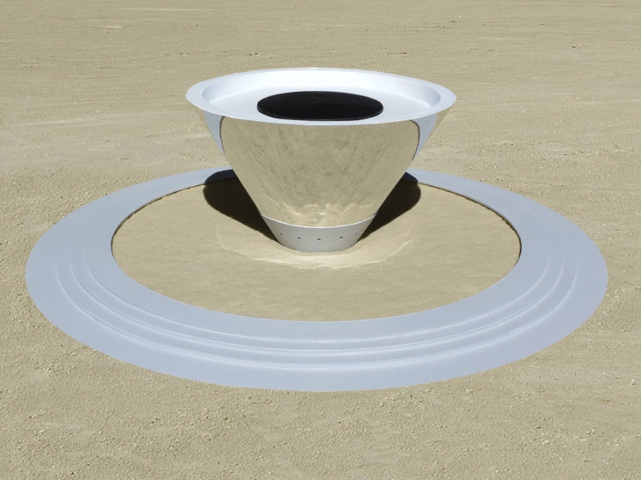 The setup is deceptively simple. A circular concrete ring, complete with a landing pad and three descending steps, defines the play area. Inside that ring is a field of refined sand. Rising from the center is a tall cone wrapped entirely in polished mirrored steel. Solar panels sit on top, charging batteries during the day so the whole thing lights up at night. No Wi-Fi. No app. No QR code. Just you, the sand, and your own warped reflection staring back at you from a cone.