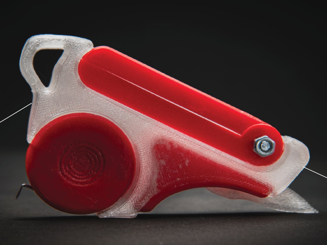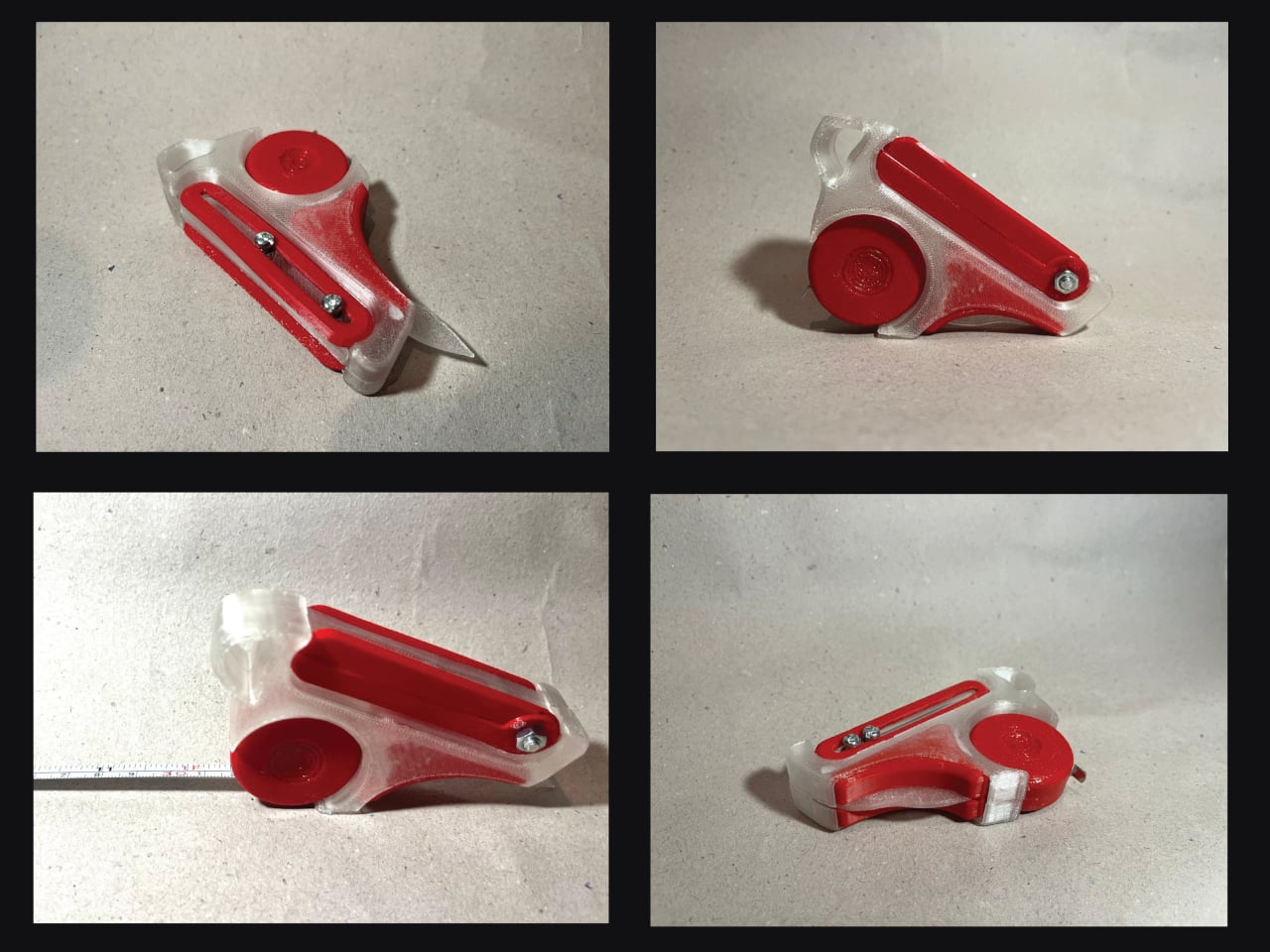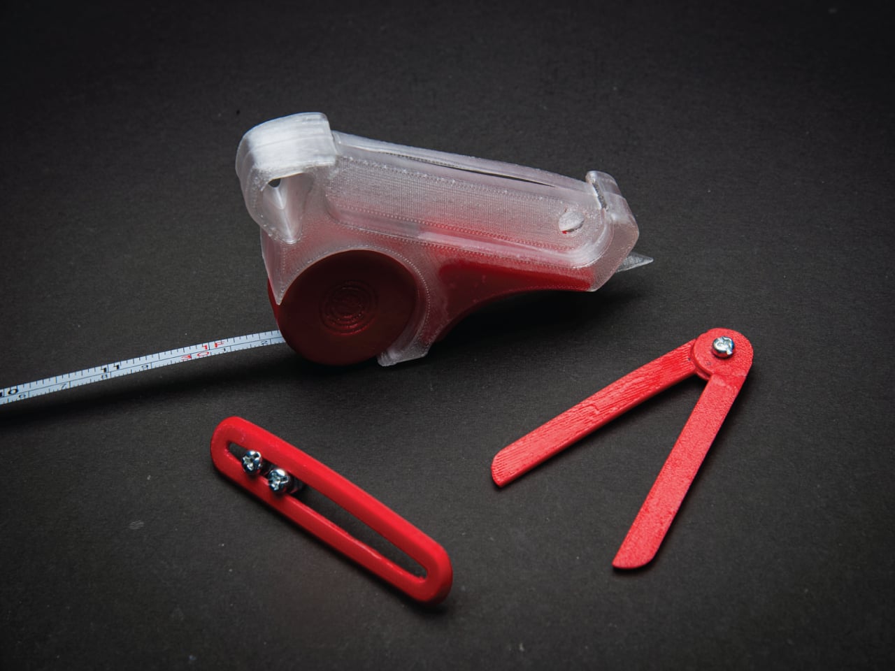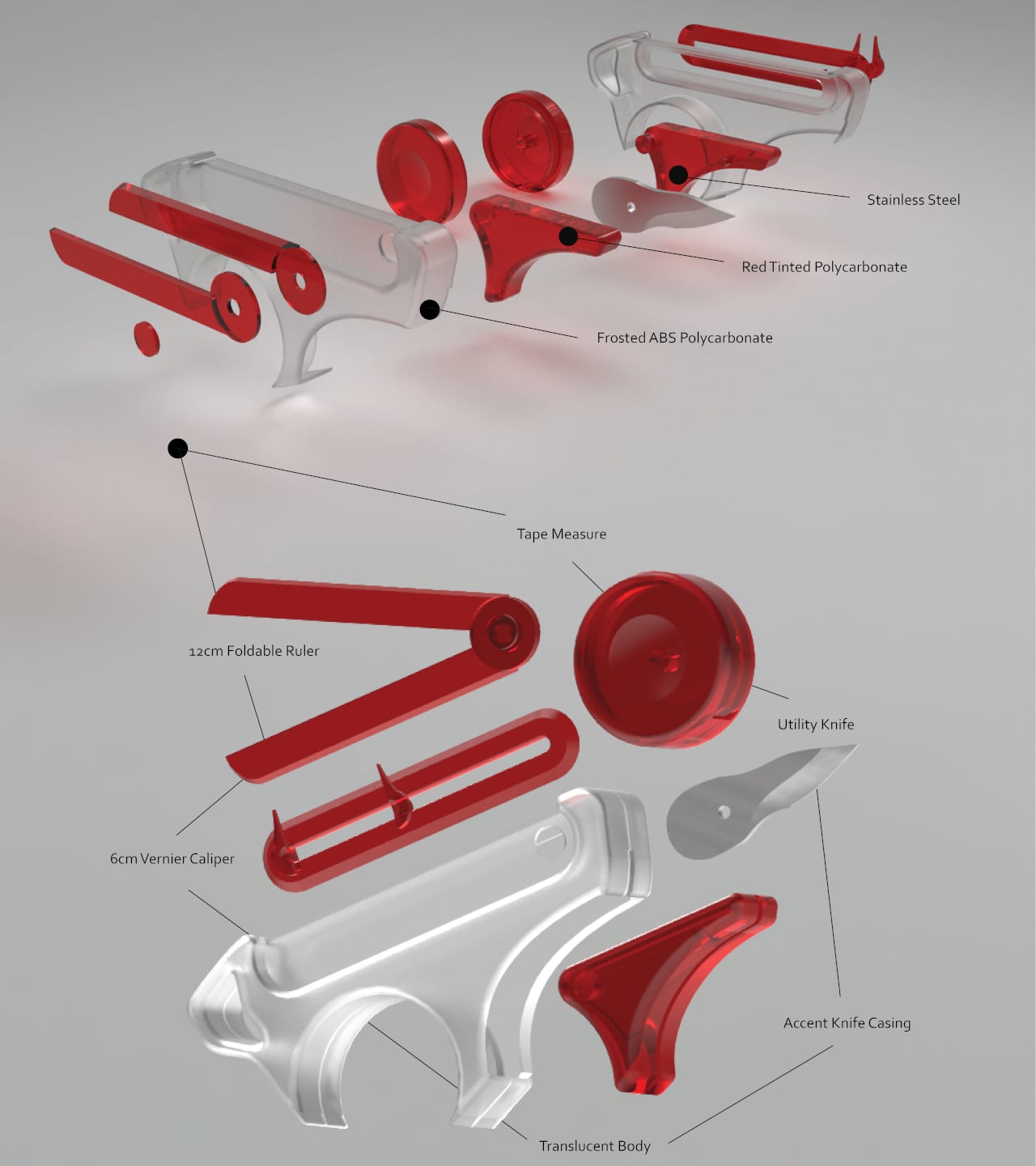 Those four are a tape measure, a 12 cm foldable ruler, a 6 cm vernier caliper, and a utility knife, all integrated into a single handheld device. The body is frosted ABS polycarbonate, with red-tinted polycarbonate accents and stainless steel for the blade and hardware. The translucent construction lets you see the internal components at a glance, which feels appropriate for a tool aimed at designers who spend a lot of time thinking about how things fit together.