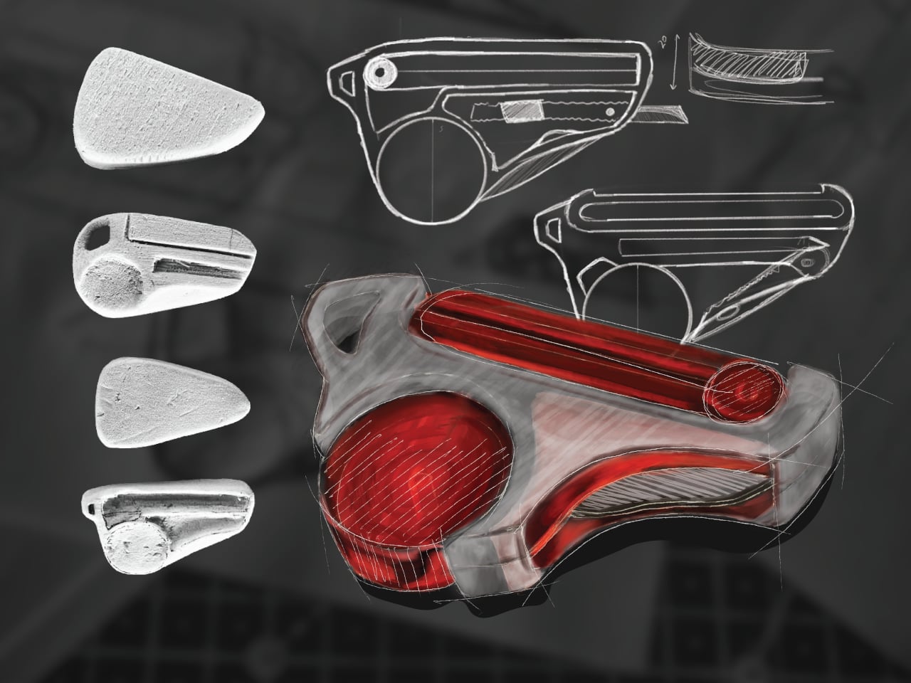 The form went through extensive iteration, with dozens of sketched directions and physical grip studies preceding the final shape. That process matters because fitting four tools into something pocket-sized is a mechanical problem as much as a visual one. Each function needs a deployment mechanism that doesn’t compromise the others, and the grip has to stay comfortable when you’re switching between them repeatedly during a long session.