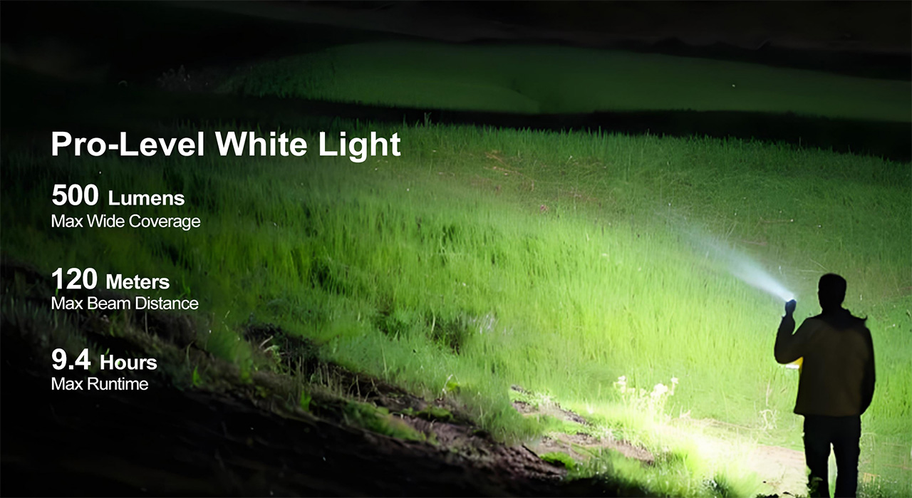 Seven brightness modes on the white LED, running from Moonlight all the way up to 500 lumens with a 120-meter throw, cover essentially every situation you’d reach for a pocket light. The red LED adds a low-impact visibility option for night walks, map reading, or any context where torching someone’s retinas with 500 lumens would be socially unacceptable. The built-in 18-hole golf stroke counter lives quietly inside the interface, accessible with a short press to count strokes and a long press to advance holes, with bezel rotation letting you review the front or back nine. If golf means nothing to you, it switches off and disappears entirely.