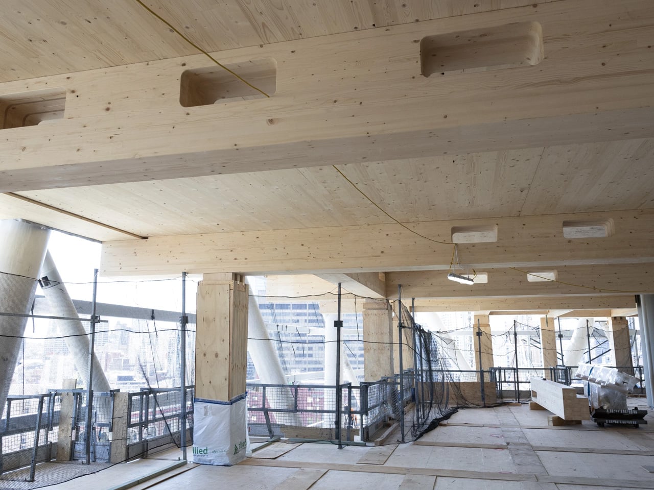 The structure relies on a hybrid system of concrete, steel, and engineered wood, a combination that sets it apart from purely timber towers like Norway’s Mjøstårnet. The use of concrete and steel allows the building to reach heights that timber alone could not sustain, while glued-laminated timber columns and cross-laminated timber slabs, sourced from Europe, are incorporated throughout. In total, roughly 10,000 cubic meters (353,000 cubic ft) of engineered wood will be used in the build.