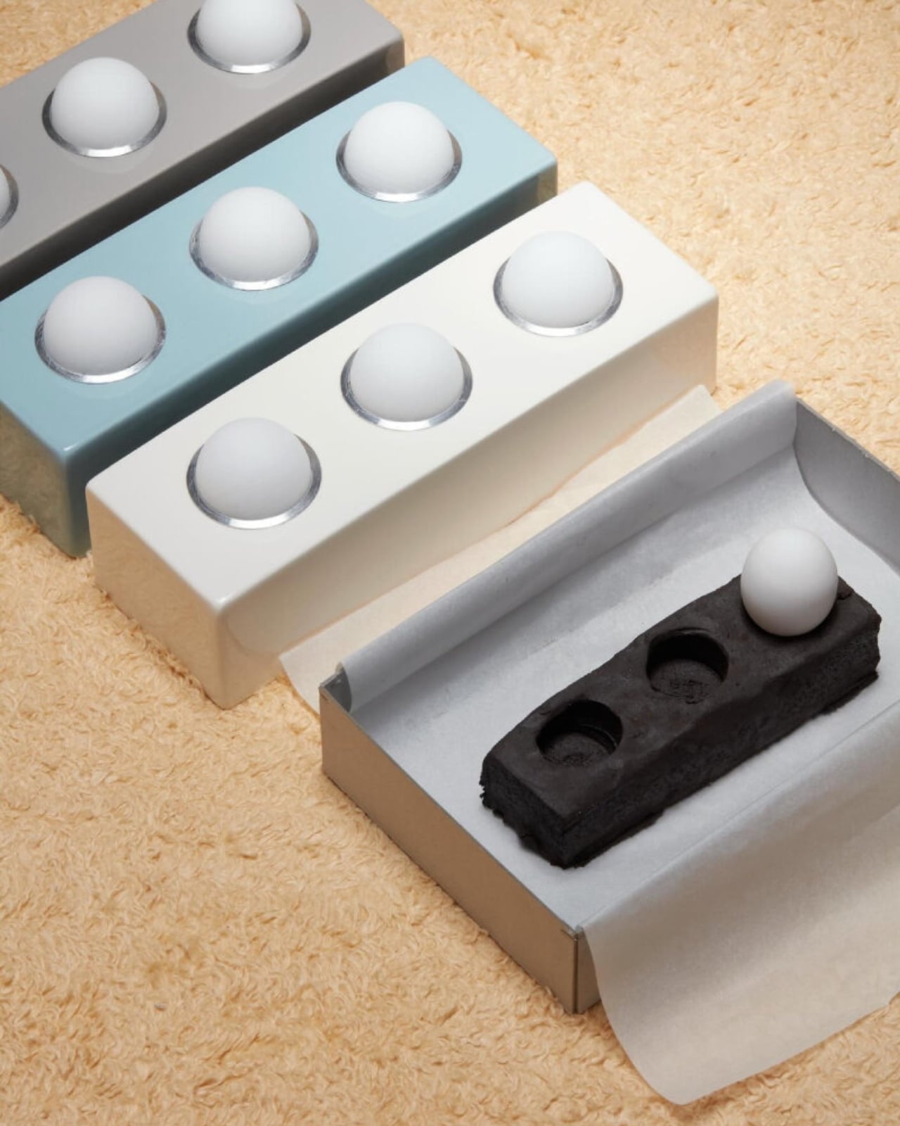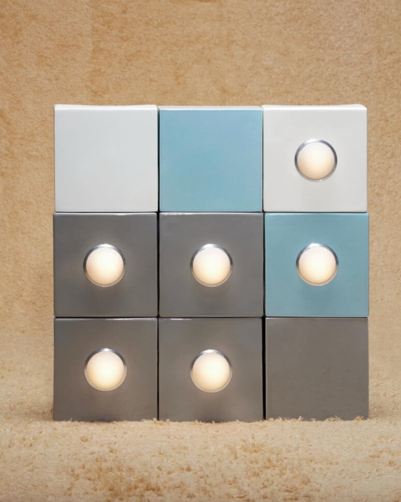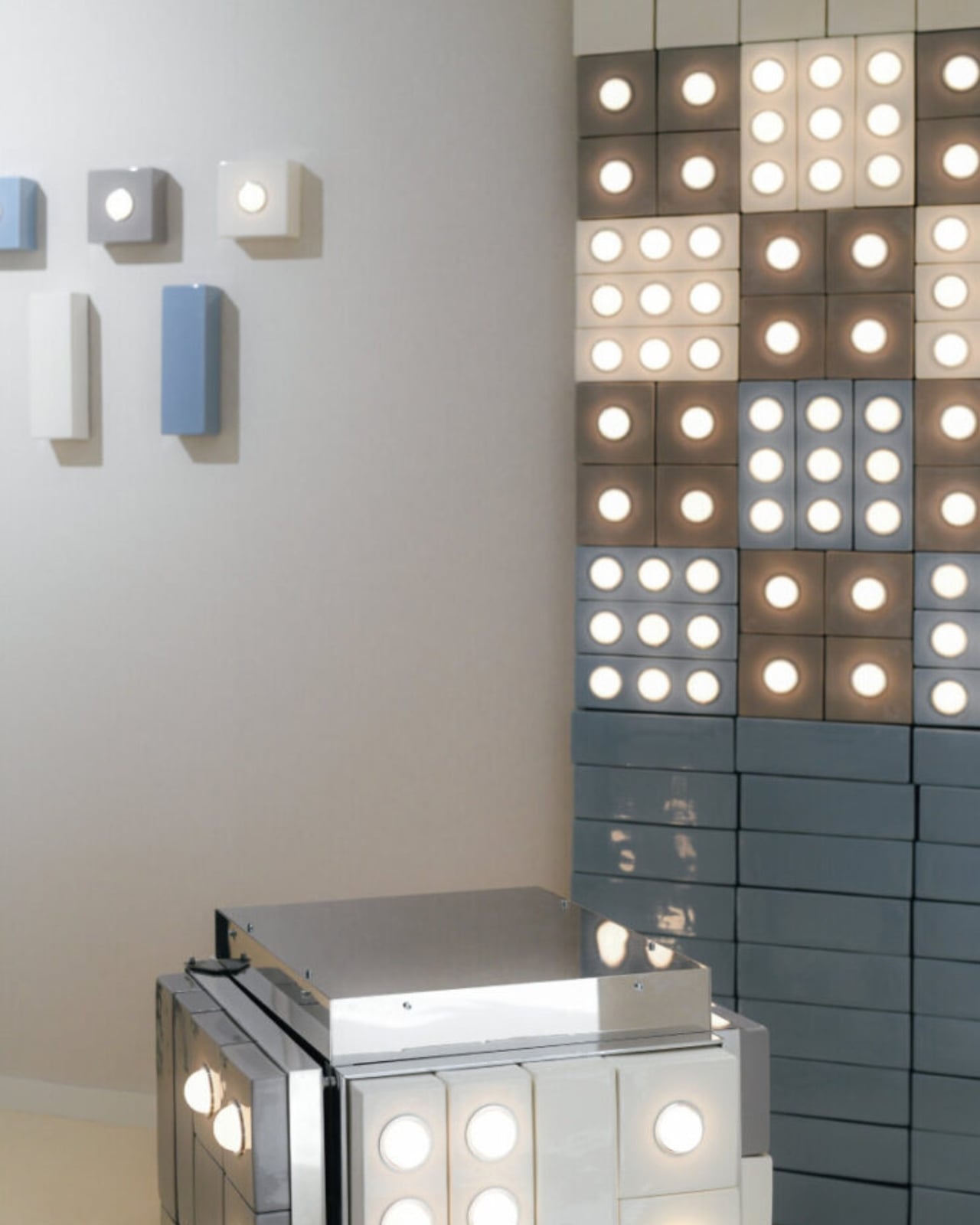 Glowtile works around a deceptively simple concept: glazed ceramic tiles, each fitted with an egg-shaped handblown glass diffuser set inside a ring of anodized aluminum. Two tile formats make up the system: a square 15×15 centimeter module and a rectangular 30×10 centimeter one. You can arrange them in grids, stagger them, mix both formats together, install them on walls, ceilings, or even set them on the floor to shoot light upward. It’s the same compositional freedom you’d have with any standard tiling job, except your tiles glow.