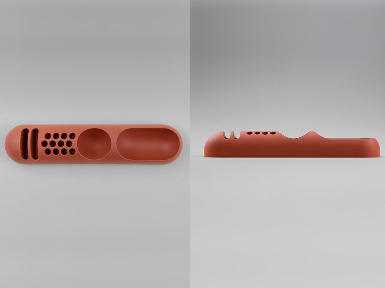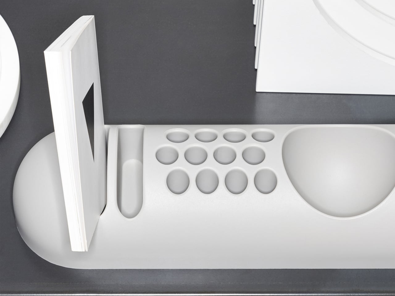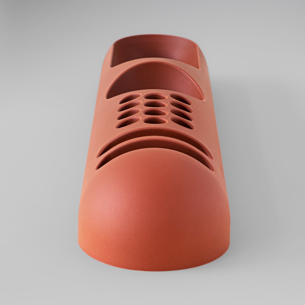The top surface divides into three zones with no visible partition between them. The dome end opens into a large oval scoop for bulkier items; the center holds a 3-by-4 grid of individual circular holes, each sized for a single pen or brush; the tapered tail has two horizontal slot grooves that hold flat objects like rulers or small notebooks upright. None of this reads as a spec sheet in person. It reads as a single continuous gesture that happens to organize things.
