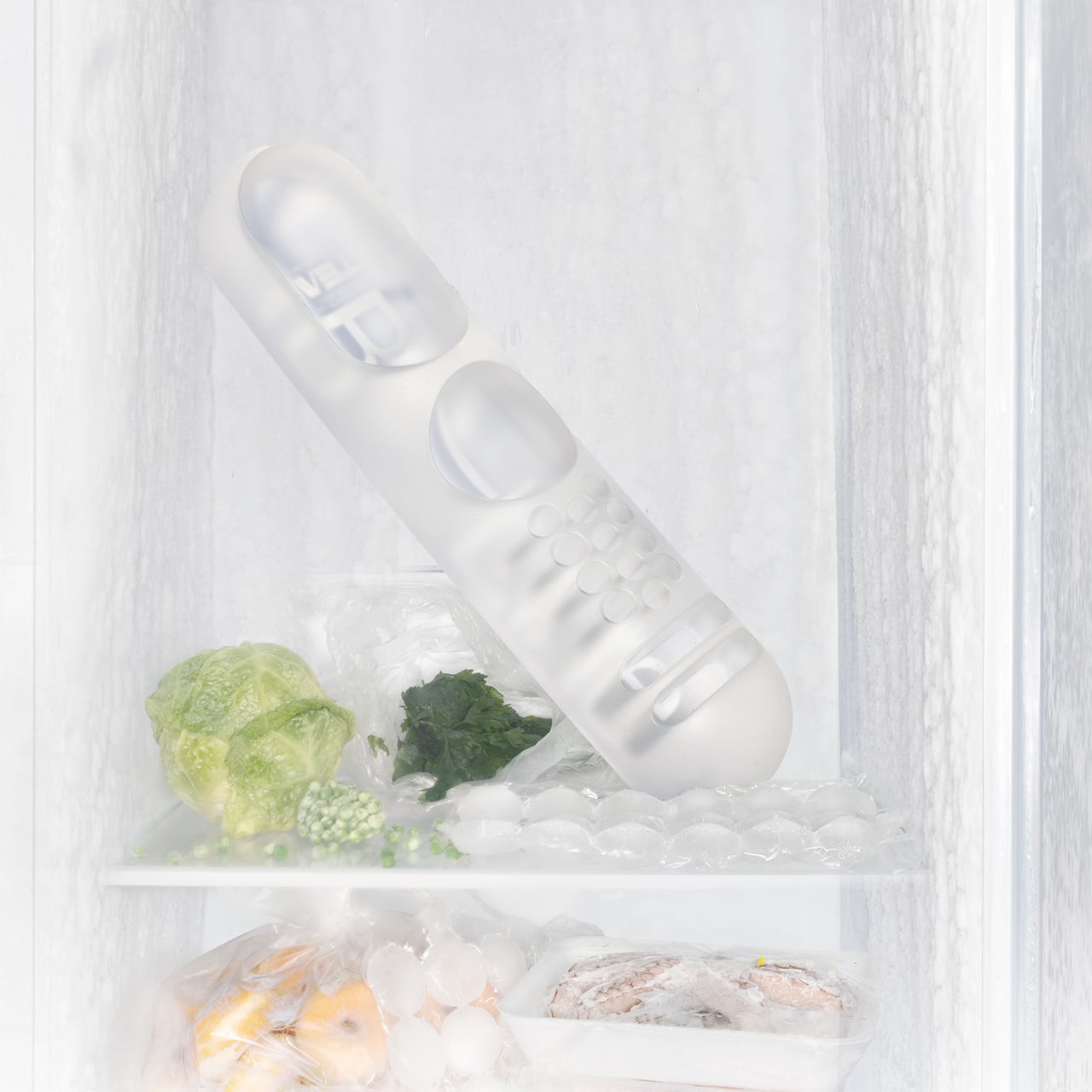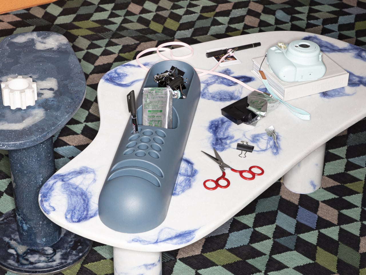 B-Line’s campaign photography makes a quiet argument for where BOB actually belongs. It appears on a marble coffee table holding binder clips and scissors, on a chair seat catching pencils and sunglasses, and on a bathroom vanity with makeup brushes in the pen holes and cotton pads in the scoop. One image places the ice-colored version inside a freezer, either a dry joke about the colorway name or a genuine hint that the flexible polyurethane handles cold fine. Probably both.