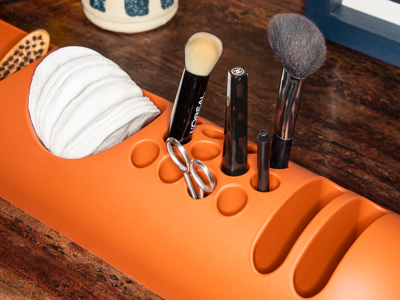 That flexibility is worth taking seriously. BOB lies nearly flat on any surface, which means it doesn’t create visual clutter the way upright organizers do. It also means the pen holes require implements long enough to stay upright on their own, which is a quiet limitation Colombo’s grid doesn’t advertise. Short lipstick caps, small erasers, and anything under roughly 10 centimeters will just rattle around rather than stand.
