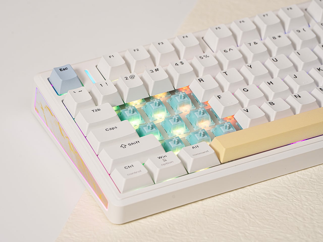 Underneath each keystroke is a gasket-mount structure paired with a five-layer sound-dampening system. The polycarbonate plate adds some flex to the mix, and the result is that soft, cushioned thud the keyboard community has taken to calling “creamy.” It is one of those things that sounds like marketing until the first time a finger lands on a well-tuned gasket board, and then it just sounds like a very good reason to keep typing.