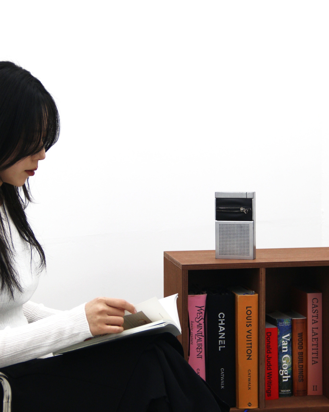 Physically, the object is composed and self-assured. A compact rectangular body in brushed silver aluminum sits below a band of dark fabric bisected by a metal zipper, the kind of heavy-duty hardware you’d find on a quality jacket, not a flimsy fashion detail. The lower half houses the speaker grille: a grid of evenly punched dots that reads like something out of a Dieter Rams archive, which is very much a compliment. The visual language is minimal without being cold, functional without being dull. It looks equally at home on a credenza beside art books and on a desk next to a keyboard.