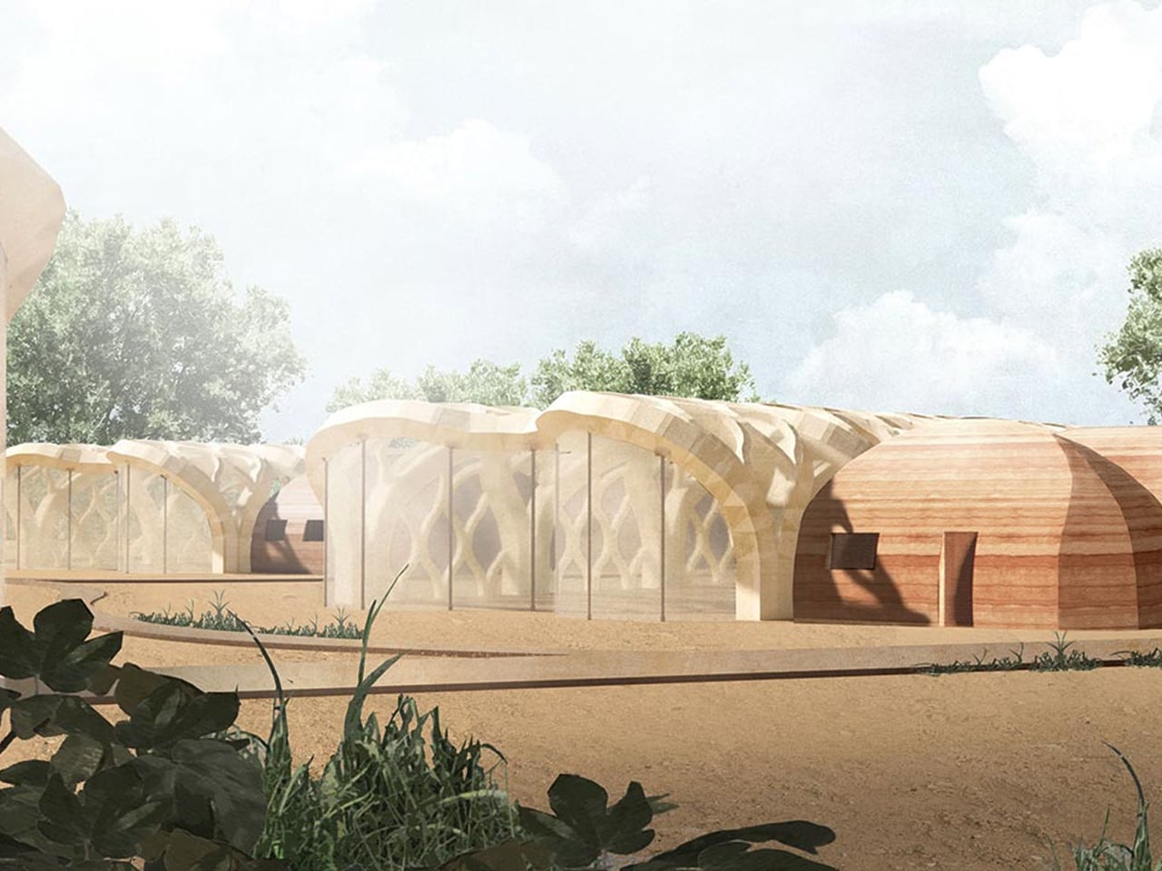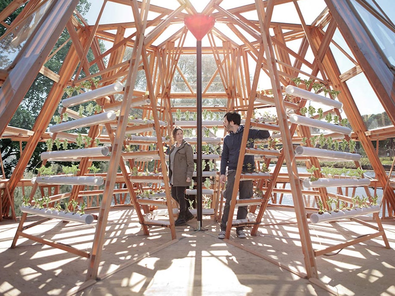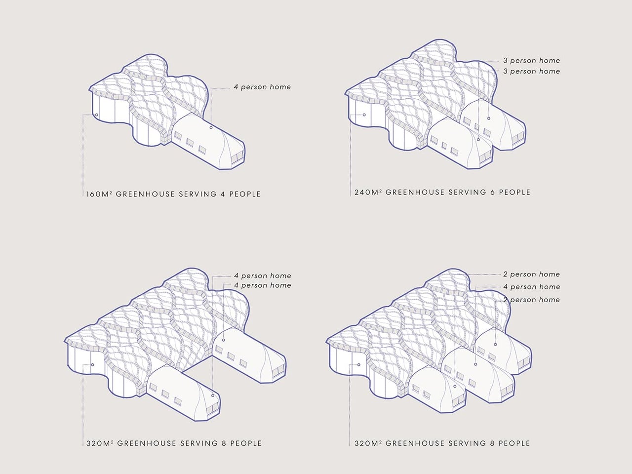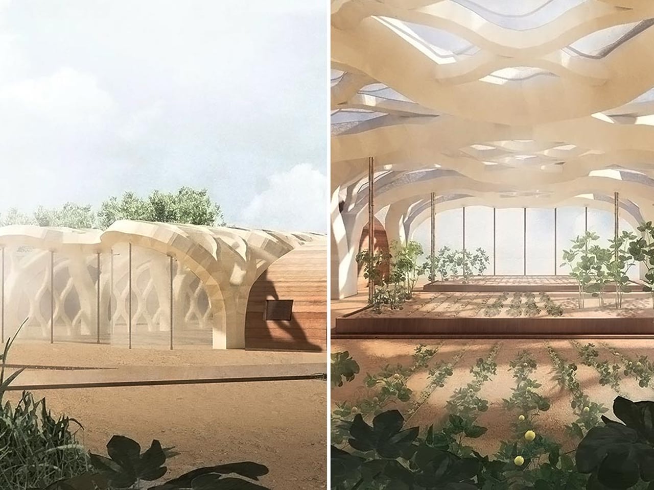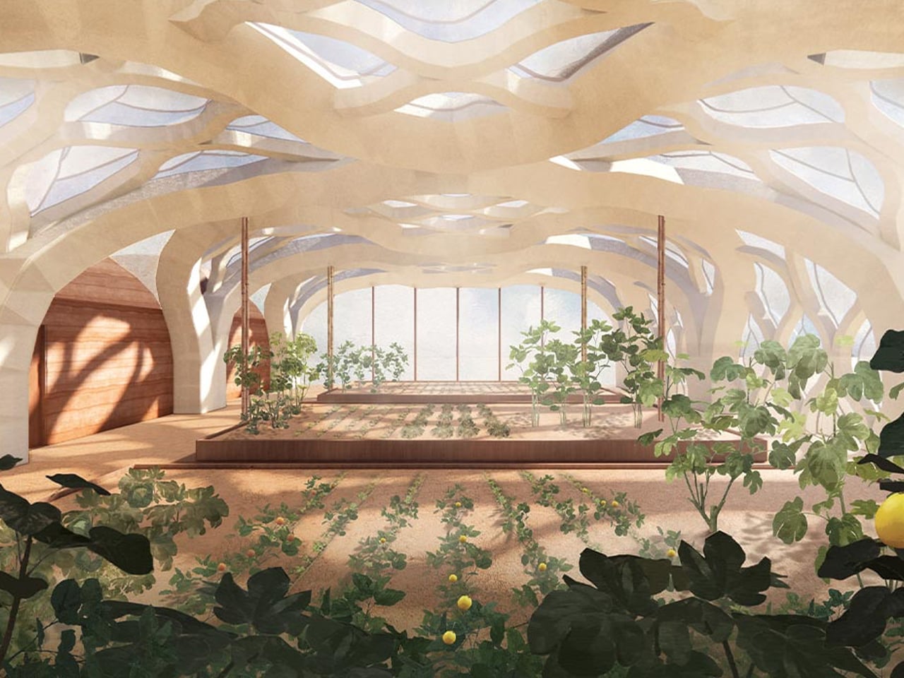 These bamboo-paper greenhouses can connect to soil-based dwellings that regulate temperature naturally. Hague envisions them as shared spaces for families in rural communities, providing food self-sufficiency and reducing plastic use.