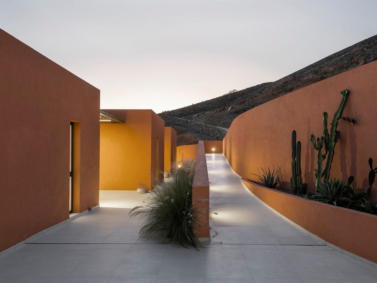 The resort steps down the slope in what the architects describe as an amphitheatre-like arrangement. As you move through the site, open terraces reveal sweeping views of the Aegean while more private rooms are tucked deeper into the hillside. The walls throughout the project are finished with textured render in warm, earthy tones, which helps the architecture blend naturally with the surrounding rock.
