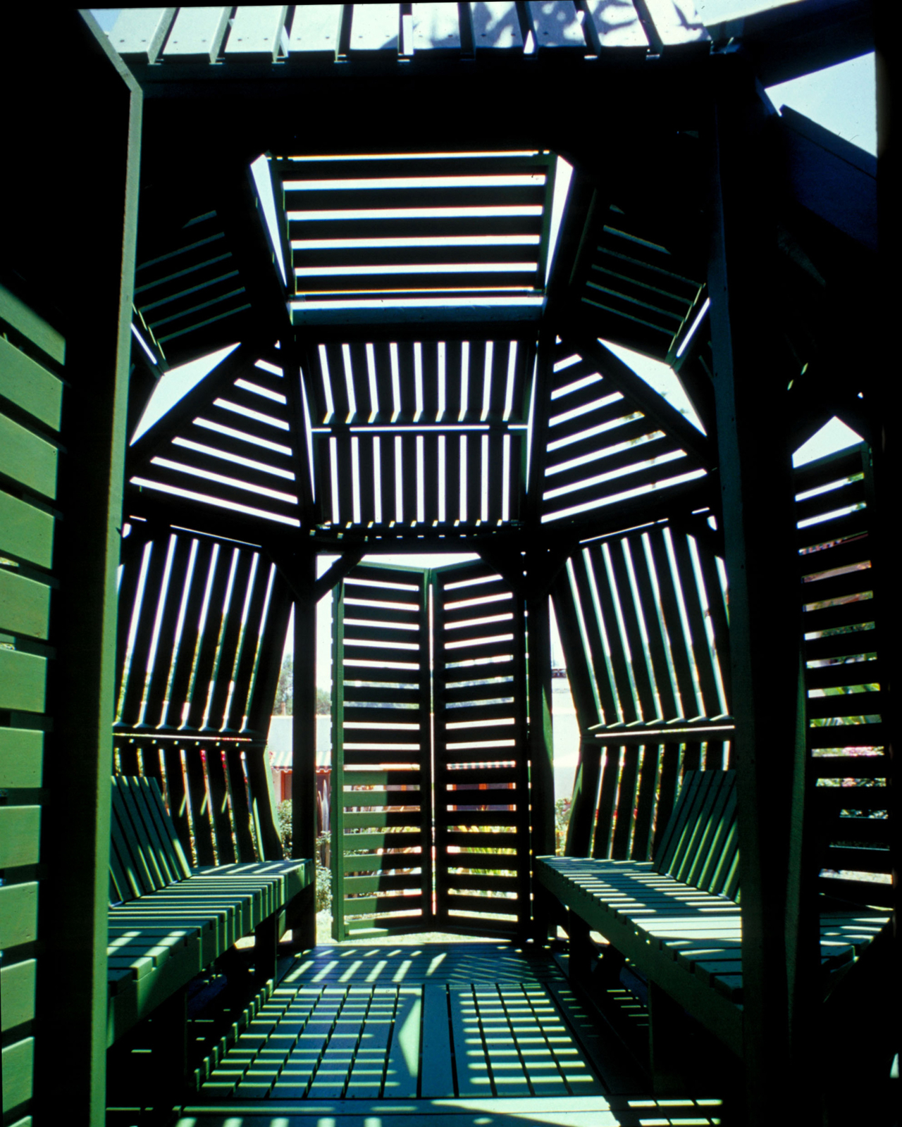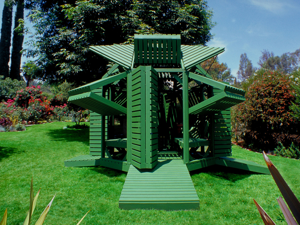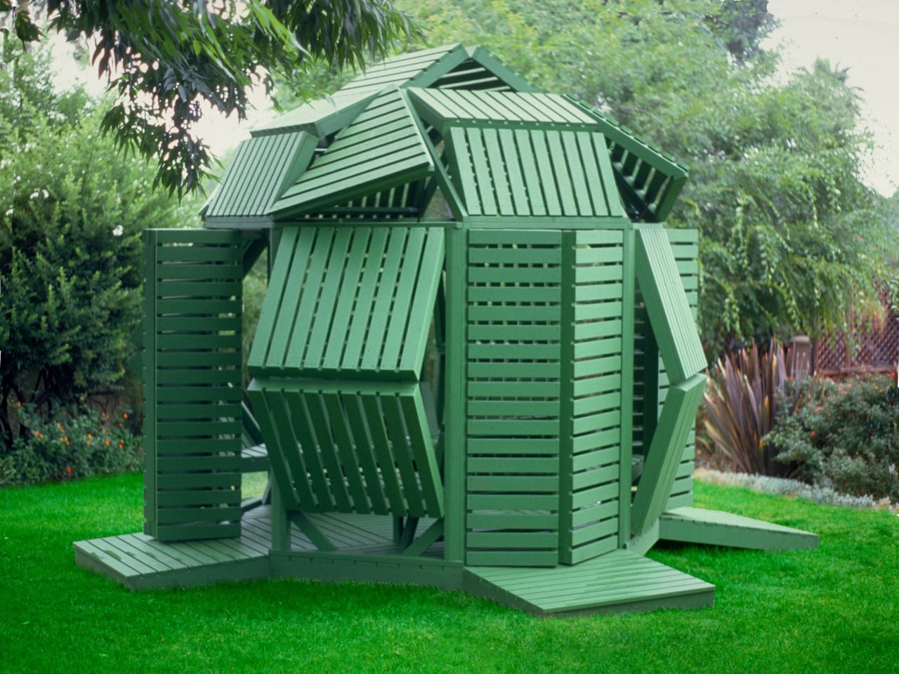 Jantzen has spent decades proposing architecture that responds dynamically to its occupants, much of it remaining on paper. This pavilion is one of the cases where the idea got built, and the result holds up at close range. The slatted wood is honest about what it is, the green paint ties the structure to the garden without trying to disappear into it, and the hinge mechanism does exactly what it promises.