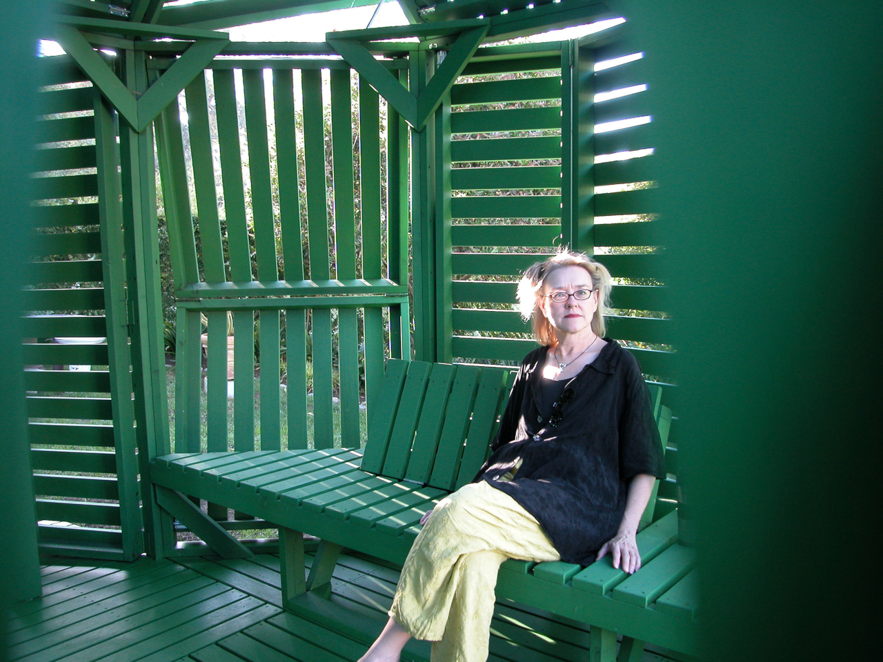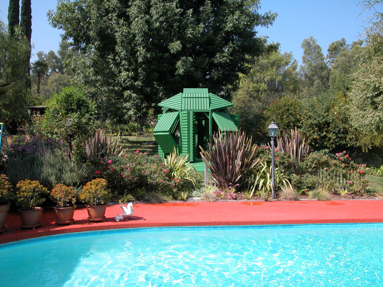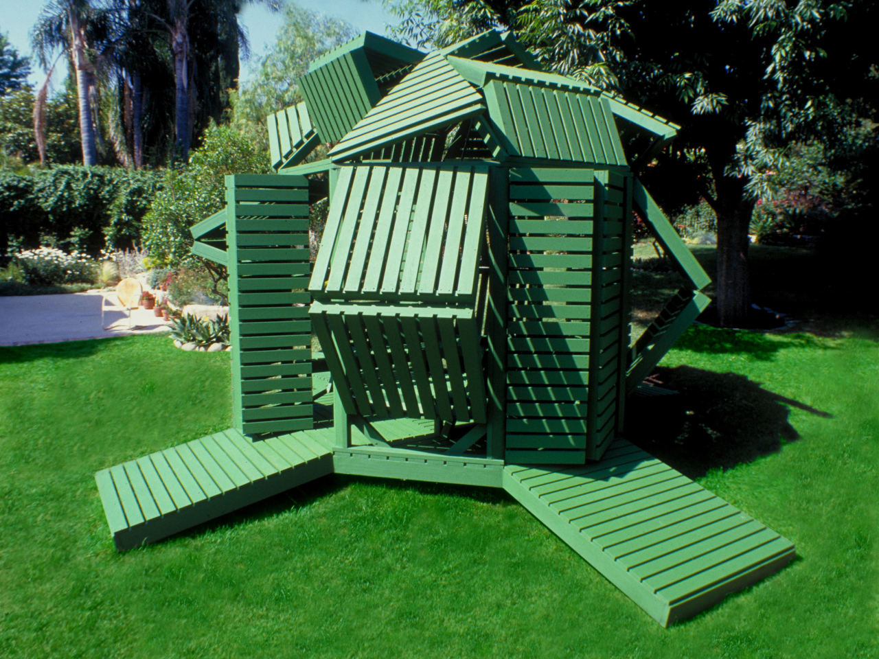Jantzen has spent decades proposing architecture that responds dynamically to its occupants, much of it remaining on paper. This pavilion is one of the cases where the idea got built, and the result holds up at close range. The slatted wood is honest about what it is, the green paint ties the structure to the garden without trying to disappear into it, and the hinge mechanism does exactly what it promises.