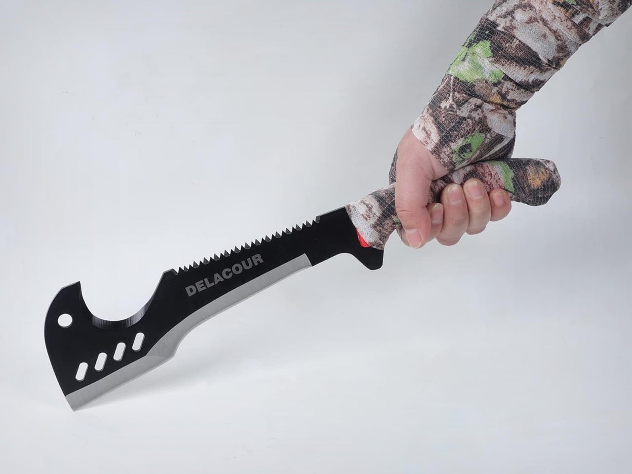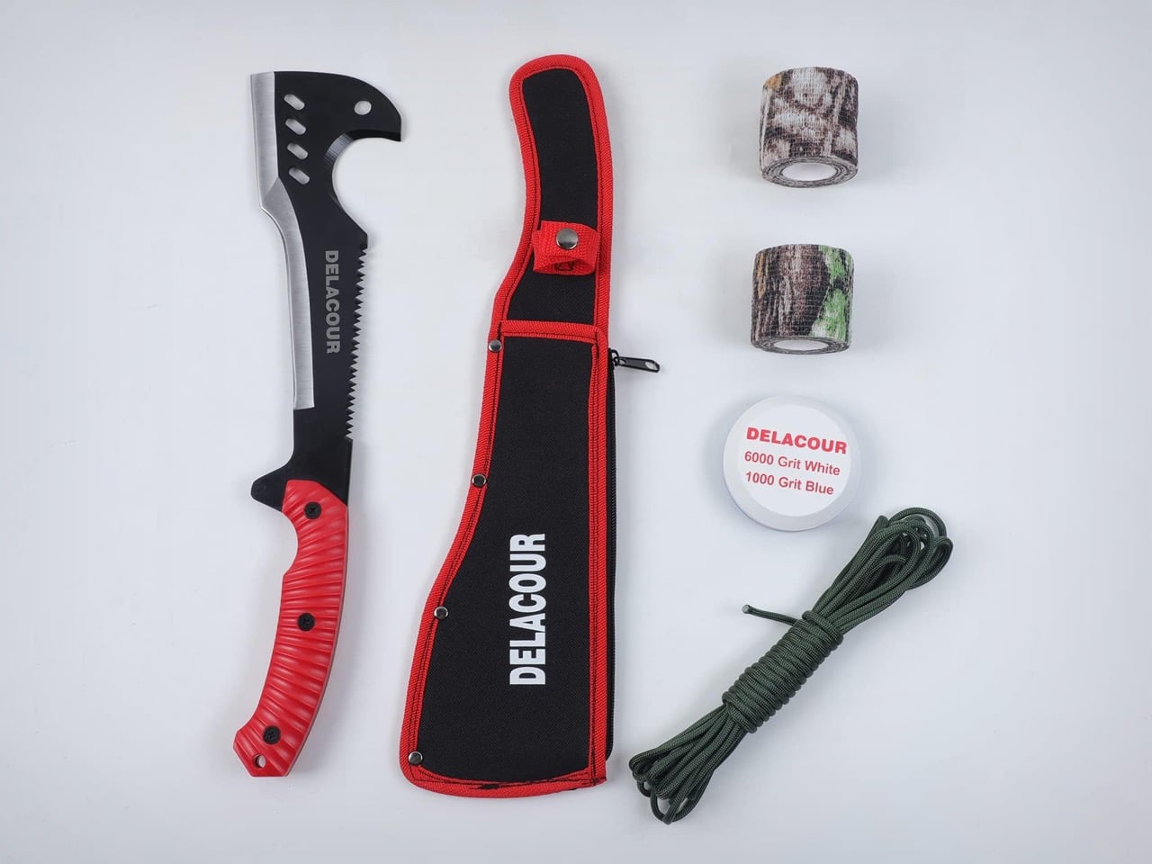 The visual language is a departure from the Woodman’s Pal’s austere utility. The injection-molded red nylon grip is aggressively textured and colored, reading more as consumer outdoor product than working tool. Lightening holes punched through the blade add visual complexity without a clear weight or balance rationale. The package throws in camo wrap tape, a paracord coil, and a dual-sided whetstone, rounding the Delacour out as an entry-level survival kit rather than a single well-considered implement.