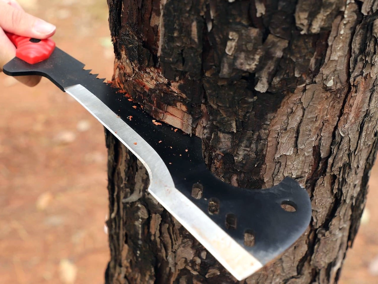 The logic behind both tools is simple: forward-weight the blade, add a reverse hook at the tip for catching and pulling vines, put saw teeth on the spine for crosscutting, and the result replaces a machete, axe, pruning hook, and bow saw simultaneously. The Delacour reproduces this geometry faithfully. The hook works. The saw back works. The forward mass creates chopping momentum that a straight blade cannot replicate.