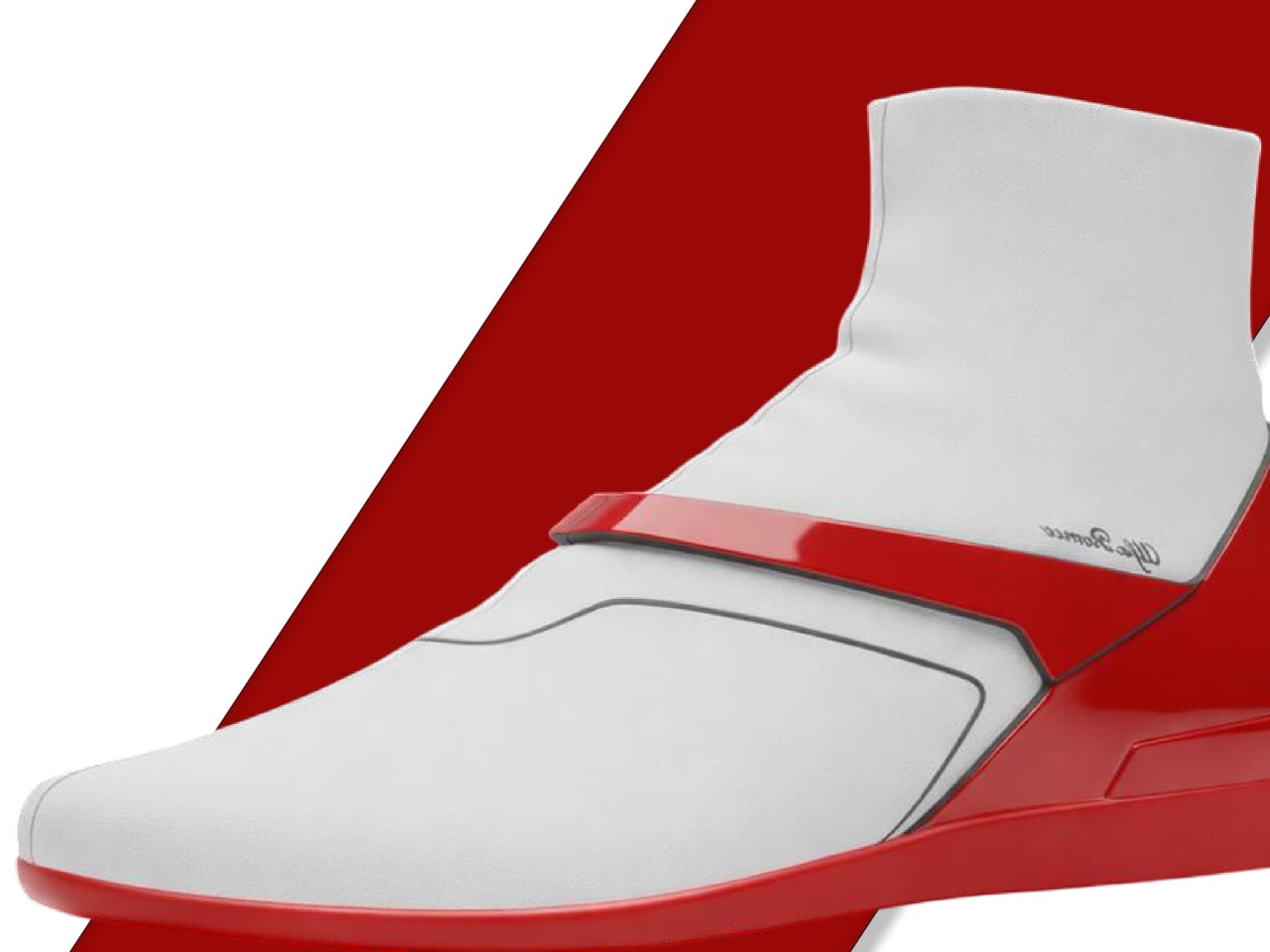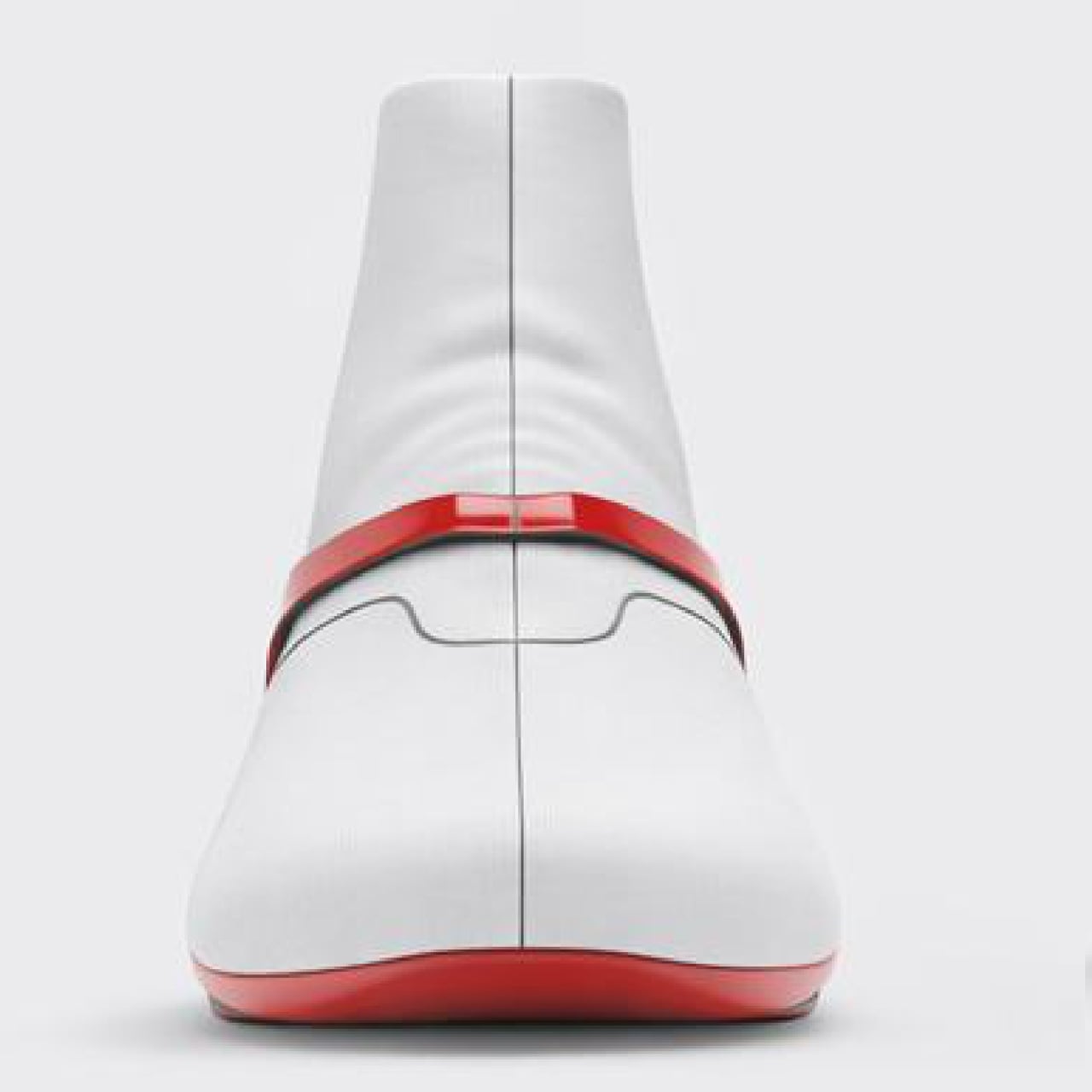 That red base is the conceptual core of the whole project. Rendered in high-gloss red, it wraps from heel to toe in a continuous form that borrows the surface logic of automotive body panels, where lines are load-bearing transitions between volumes, not decorative additions. A single glossy band sweeps diagonally across the lateral side before tapering into the toe, much like a racing stripe that has been folded into three-dimensional geometry.