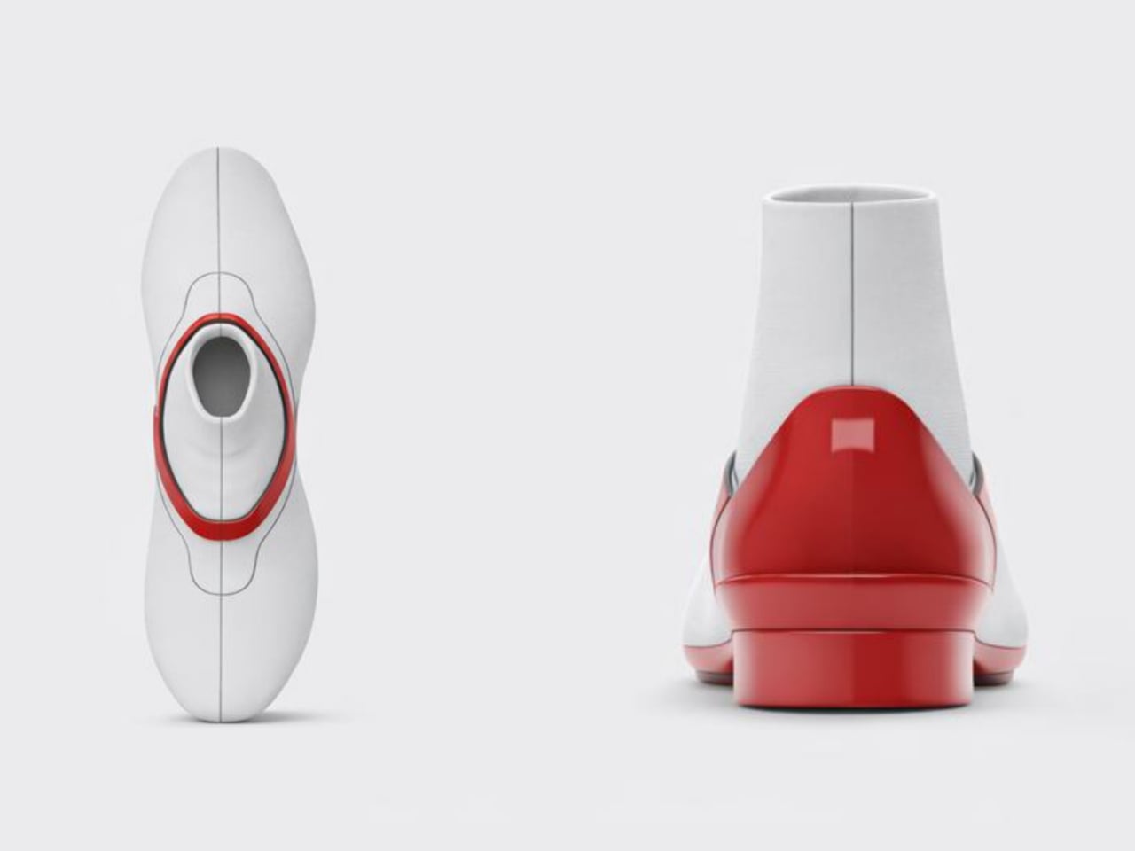 Seen head-on, the silhouette edges surprisingly close to a Japanese tabi shoe, the way the upper pulls cleanly away from a defined sole structure and wraps the foot rather than lacing or strapping around it. The proportions are quite different, but the underlying logic feels shared. Where the tabi’s separation is rooted in traditional craft and function, this concept’s version is purely formal, a visual argument about soft material against rigid geometry.