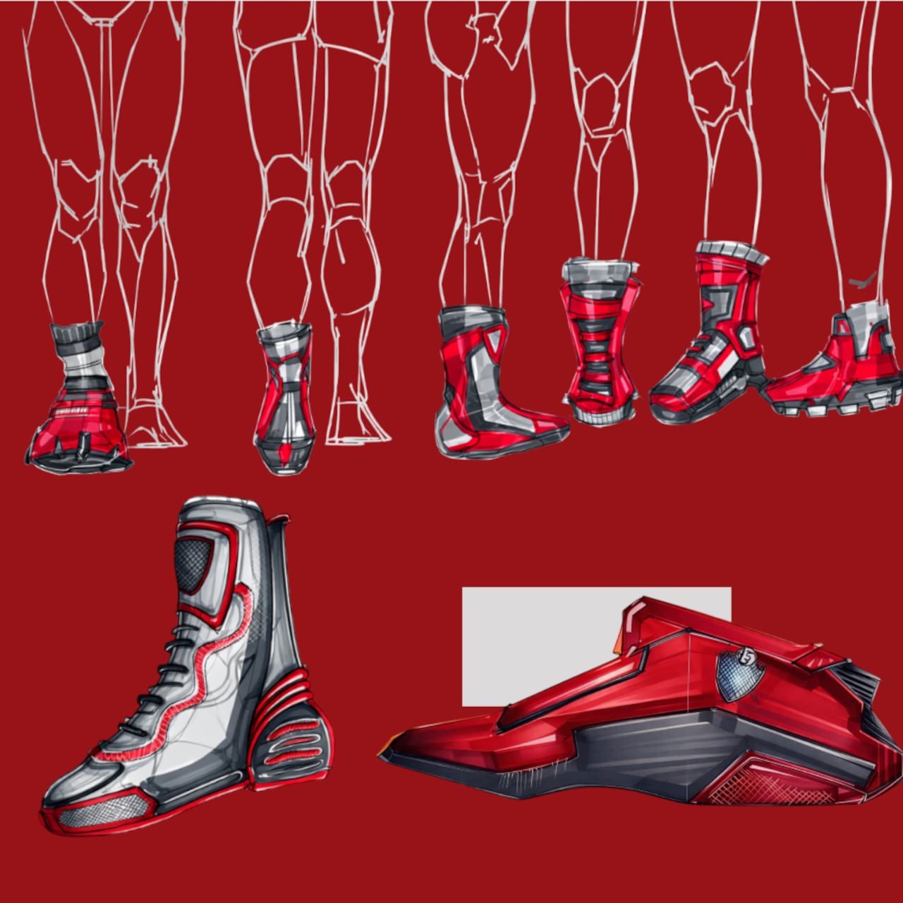 The ideation sketches make clear that the final form is a significant restraint from where the concept began. Earlier iterations pushed into armored, aggressive territory with angular protrusions and forms that read more like racing boots from a science fiction film. The decision to pare that down into something closer to a loafer-boot hybrid is either a maturation of the idea or a softening of it, and whether that calm reads as confidence or compromise is the question the final render quietly leaves open.