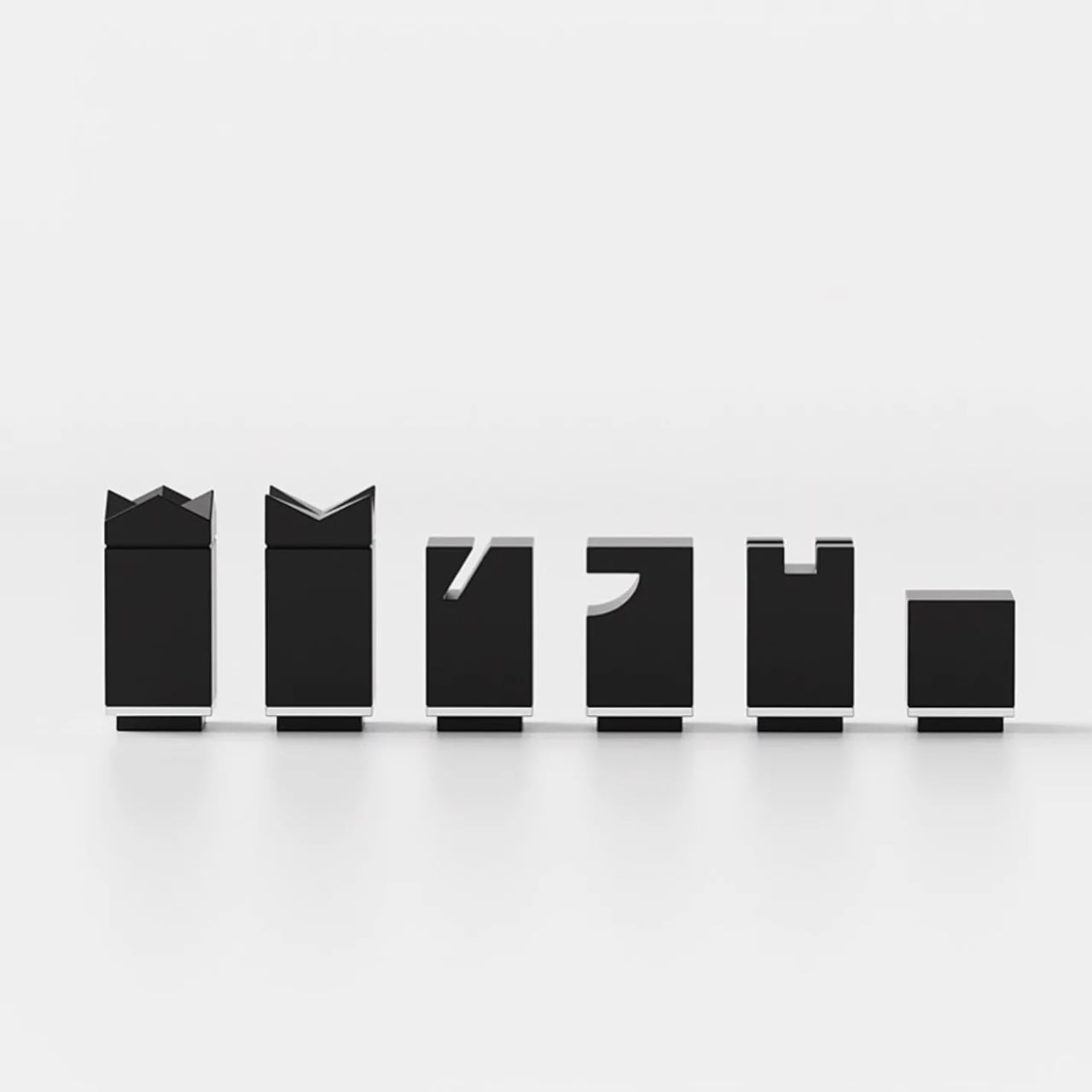 His Chess Matt Edition doesn’t borrow from that history. It doesn’t nod to it, deconstruct it, or pay ironic homage to it. Each piece is reduced to its essential geometric form, differentiated only by the minimal cuts and angles that distinguish one from another. The king wears a notched crown-like geometry, but it reads more like a Brutalist building than a monarch. The bishop has a diagonal slice through its block. The knight, traditionally the most ornamental piece on any board, is just a rectangle with a curved indent. You’d know each piece by its shape, and you’d know each shape by nothing but itself.