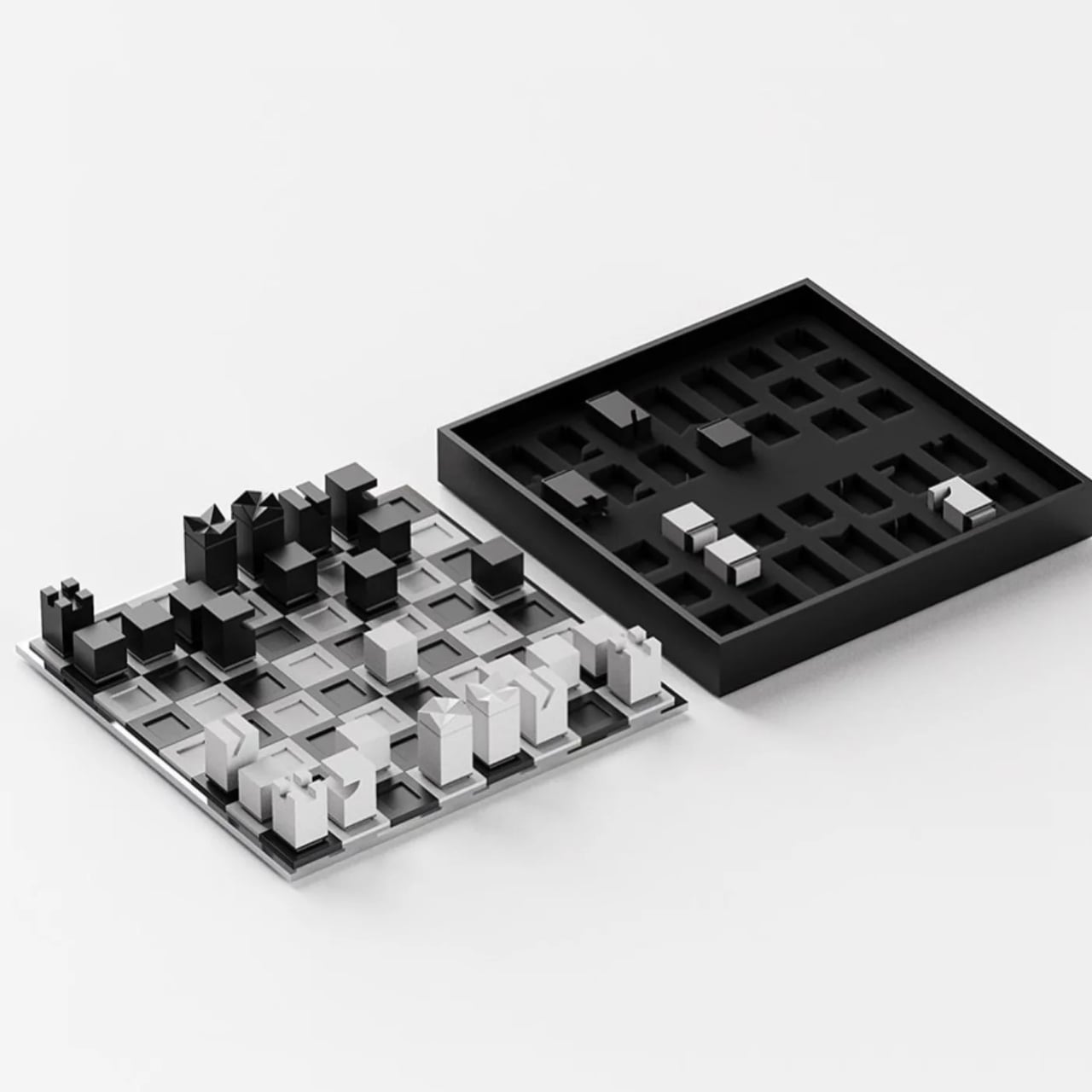 When the pieces are set up and no one is playing, the board looks like a miniature city. A grid of black and white geometric forms at different heights, each one casting its own small shadow. The intention was for the set to read as sculpture between moves, and it absolutely does. The photograph of it mid-game is more compelling than most things sold specifically as decorative objects.