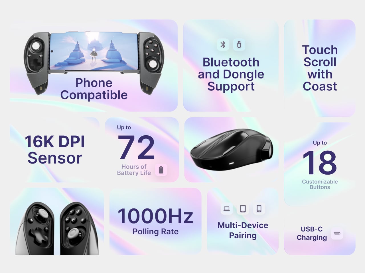 Up to 18 customizable buttons are mappable through the Pixelplay companion app, and a Layer button doubles each button’s function capacity without adding physical complexity. Battery life is rated at 72 hours per charge over USB-C, which is more than enough to outlast dedicated gaming sessions on either side of its personality.