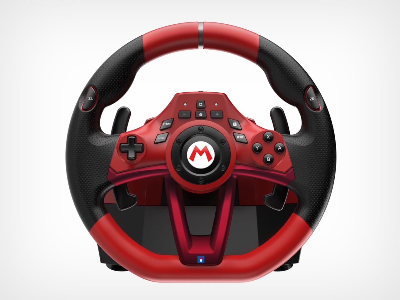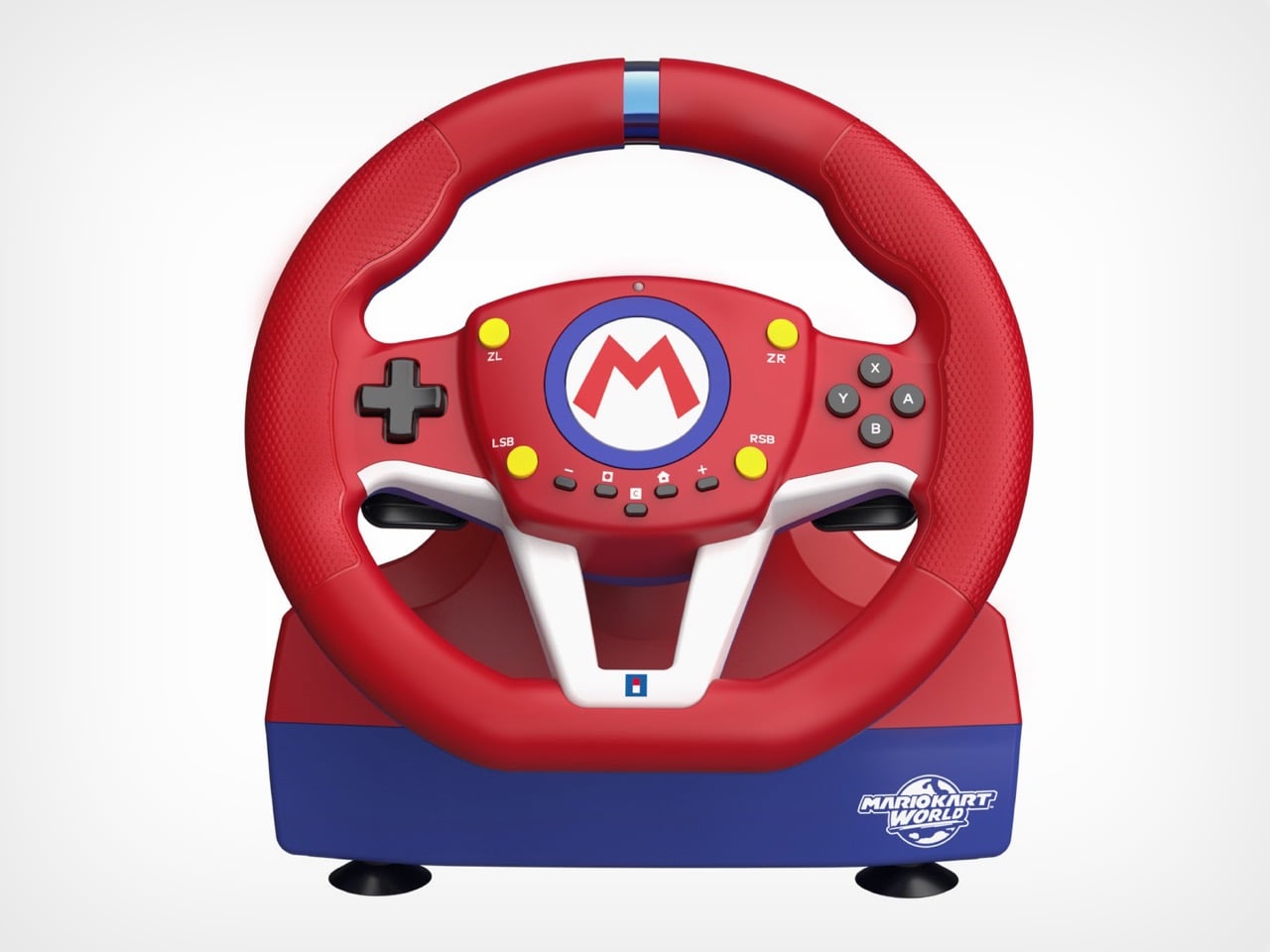 The Deluxe reads like a peripheral that wants to be taken seriously, with perforated black leather-look grip material, metallic red spokes, and a fairly restrained button cluster around the center M logo. The Mini abandons that restraint completely: solid red rim, blue and white spokes, yellow accent buttons, Mario Kart World branding on the base. They’re aimed at different buyers within the same audience, and the visual split is deliberate enough that you wouldn’t mistake one for the other in a product lineup.