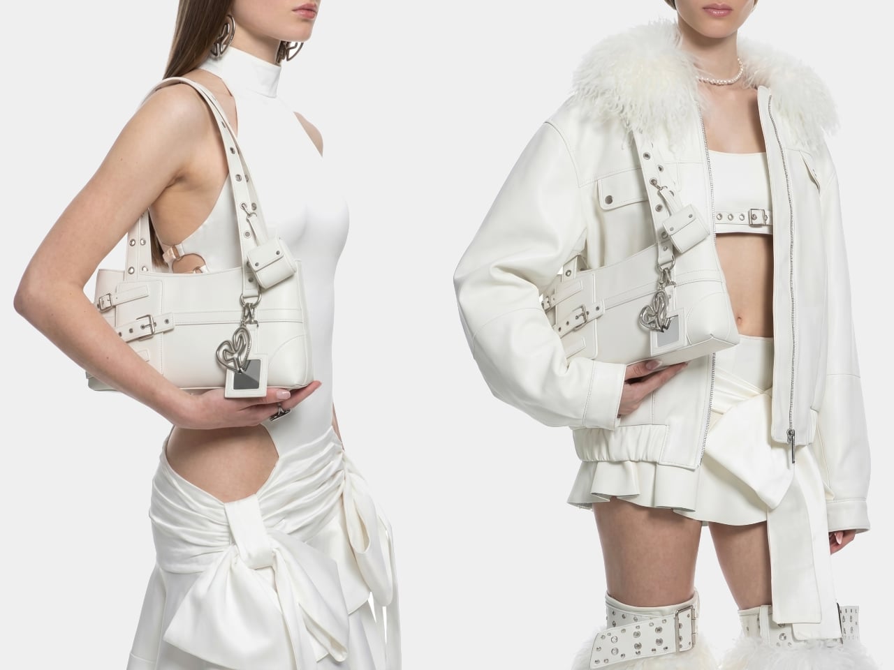 Galaxy Buds4 Pro owners get their own dedicated carry solution through three keyrings attached to the bag. Two are extendable, each fitted with a small mirror that doubles as a functional charm. The third holds a soft pouch sized for the Galaxy Buds4 or Galaxy Buds4 Pro case. A fixed keyring with the DOMINNICO logo in silver completes the set. All three hang visibly from the bag rather than disappearing inside it, which keeps the tech ecosystem part of the aesthetic rather than hidden from it.