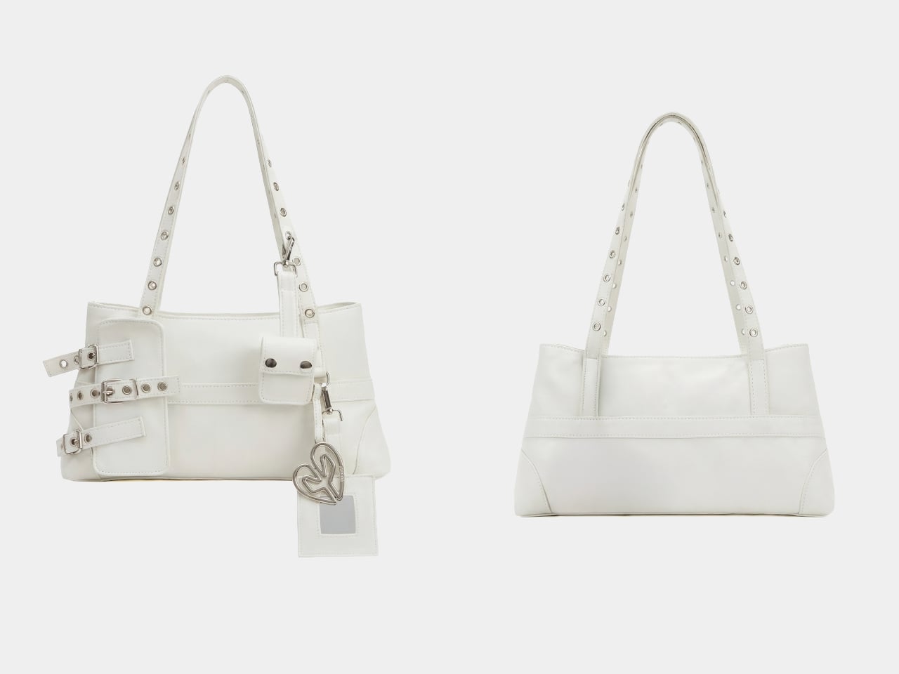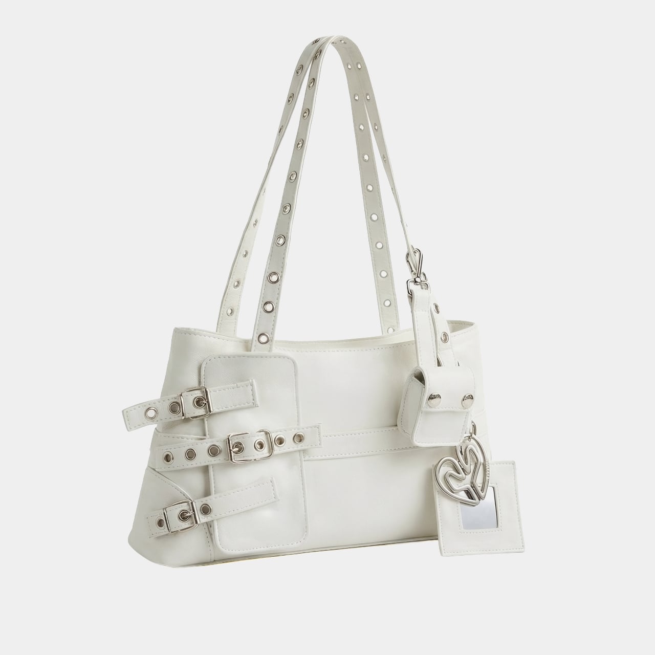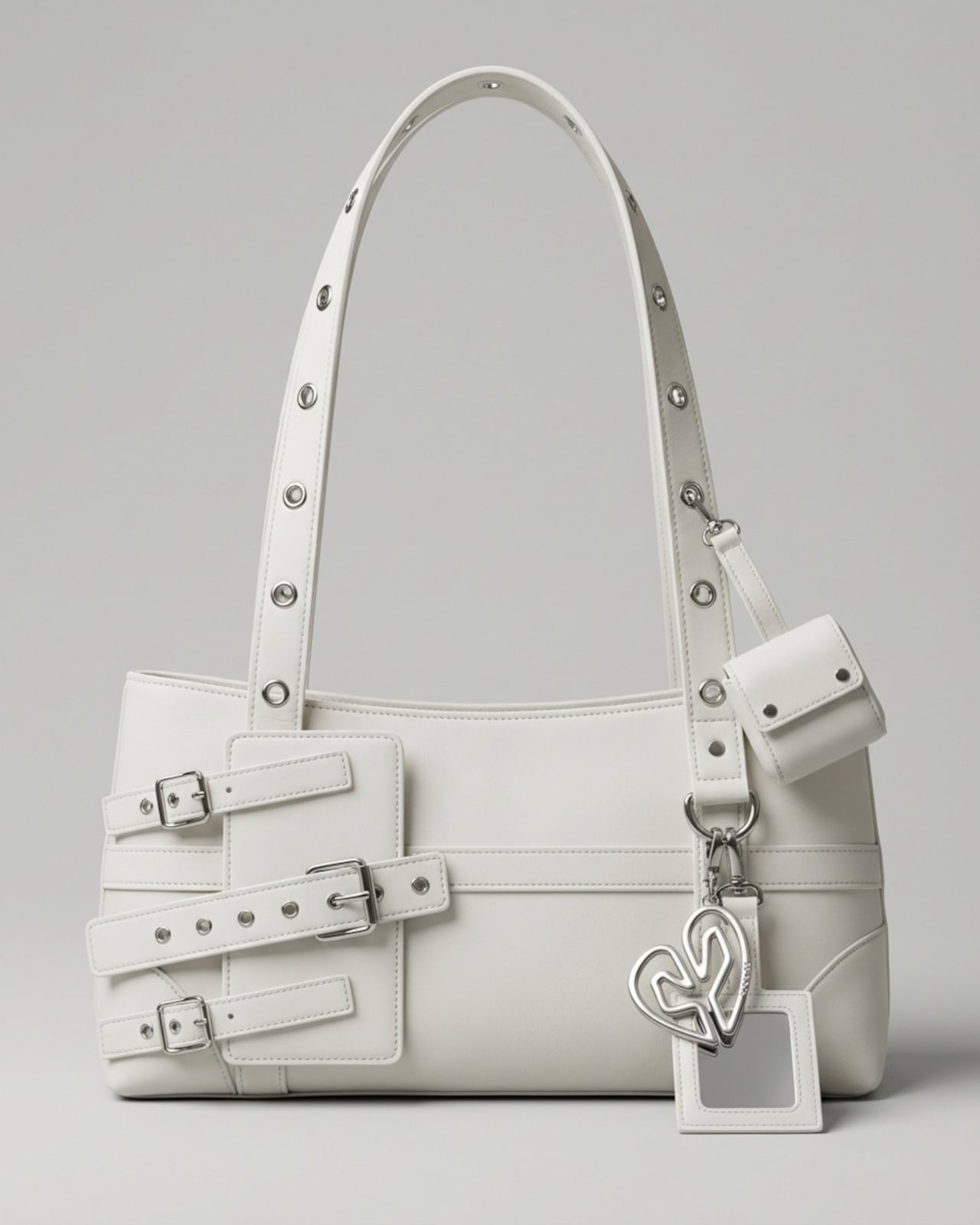 The most direct hardware reference runs along the handles. Silver eyelets line them in a pattern that mirrors the camera module rings on the Galaxy S26 Ultra, pulling one of the phone’s most recognizable physical details into a fashion context. It is the kind of detail that reads as decorative until you recognize where it came from, at which point it becomes something more like a private joke between the bag and the phone sitting inside it.