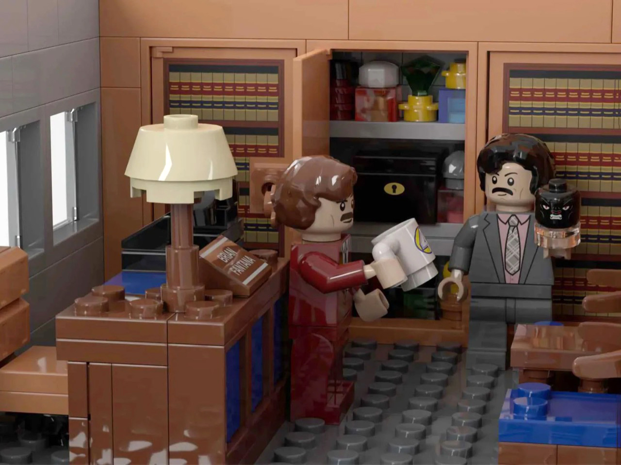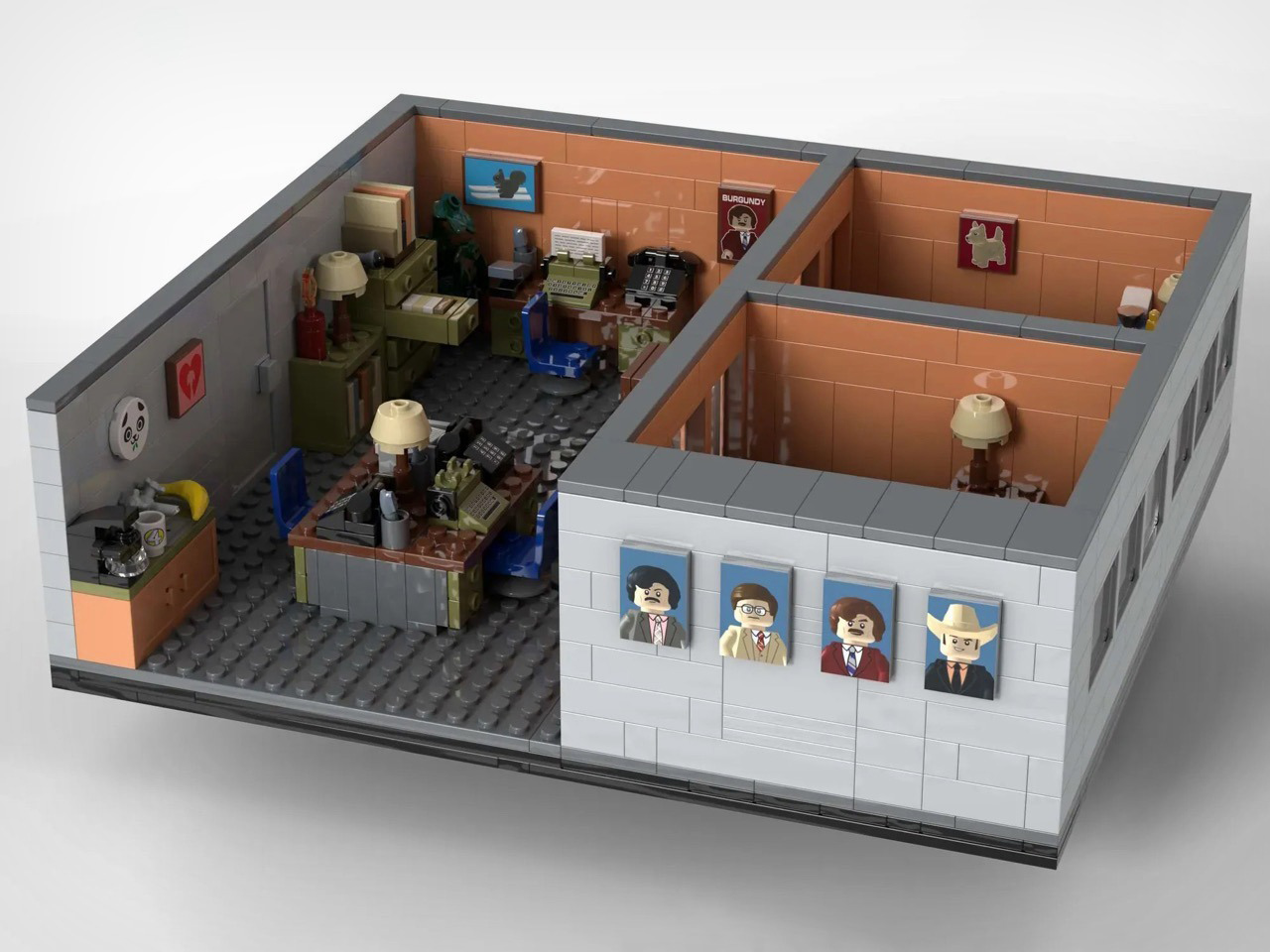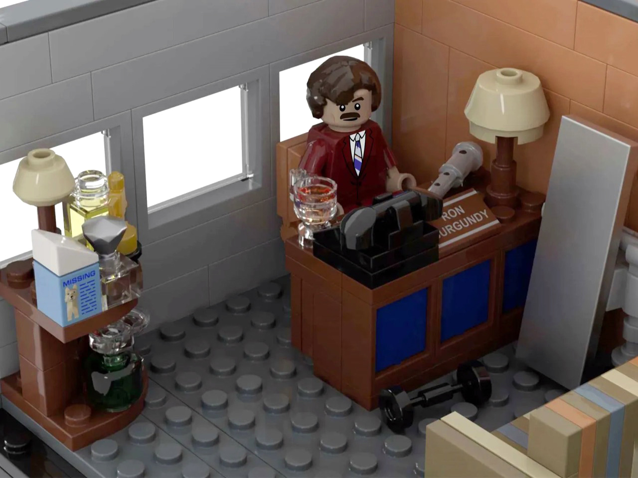 Turn to the office areas and you’ll find a bunch of details and easter eggs. Ron’s private office has his nameplate desk, a glass of scotch rendered in a transparent amber round piece, and a “Missing” poster for Baxter tucked onto a side shelf. Brian Fantana’s cologne closet, one of the film’s most beloved gags, is recreated with an open cabinet stocked with colourful brick-built bottles, with a “Brian Fantana” book sitting on his desk for good measure. The hallway outside features a glass-panel wall looking into Ron’s office, and a Ron Burgundy door nameplate that even Veronica would have to respect. My favorite detail, though, is the row of four team portrait tiles mounted on the exterior office wall, each one a miniature LEGO-art-style illustration of the Channel 4 crew. Tiny, considered, and completely unnecessary in the best way.