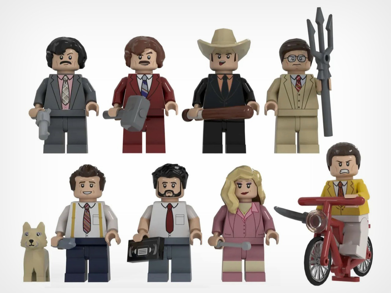 The eight minifigures are pitch-perfect. Ron arrives in his burgundy suit with a jazz flute and a scowl that says “I have many leather-bound books.” Brick Tamland, naturally, comes with his trident. Champ has his signature cowboy hat, Fantana carries what appears to be a cologne bottle, and Veronica is rendered in her pink suit with that particular expression of someone perpetually tolerating Ron’s nonsense. Baxter the dog is included as a separate figure, and there’s even a bonus Ron on a tiny red bicycle, which is exactly the kind of specific deep-cut that separates a good MOC from a great one.