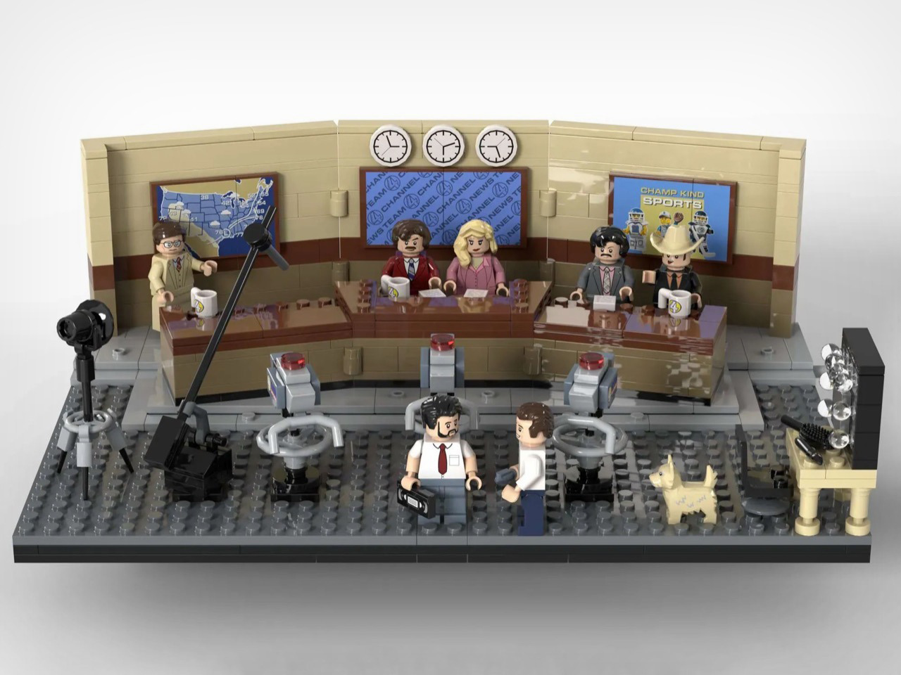 The broadcast desk is the centerpiece, and footonabrick nails the warm tan-and-brown palette of that gloriously dated 70s newsroom aesthetic. Ron and Veronica sit front and center behind their Channel 4 mugs, with Brian Fantana, Champ Kind, and Brick Tamland flanking them across the curved desk. The curved wall behind them is one of the trickier builds to pull off cleanly in LEGO, and the segmented panel construction keeps it looking smooth without losing the layered depth of the real set. Camera equipment on the studio floor, a boom-arm mic stand, and a vanity mirror station on the side round out the production floor detail beautifully.