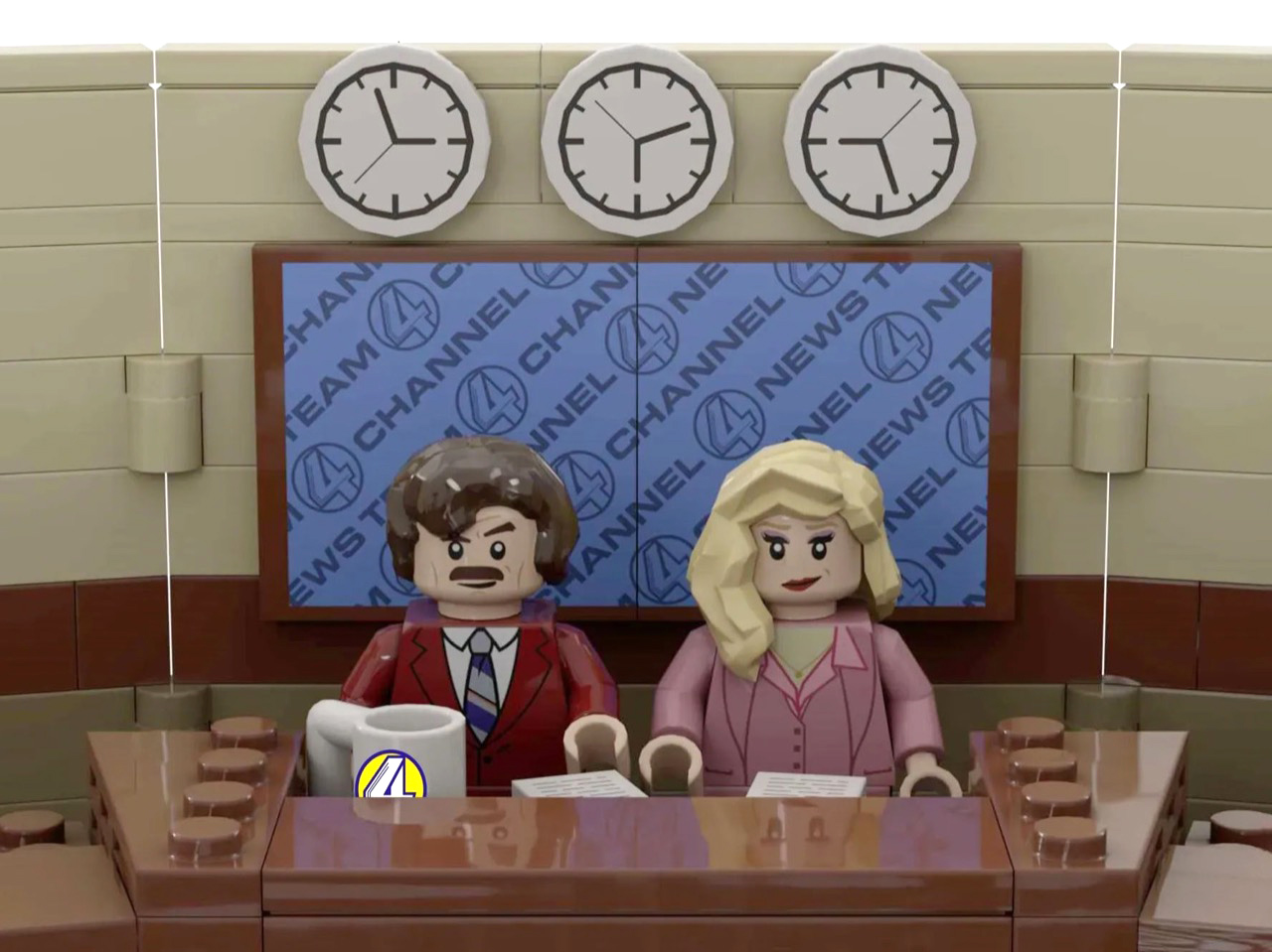 The result is a just-over-1,500-piece MOC (My Own Creation) that reconstructs the Channel 4 News Team’s world with an almost obsessive attention to detail, covering the broadcast studio, the newsroom offices, and even the KVWN news van parked out front. The studio section is immediately recognizable: a curved tan backdrop wall, three wall clocks ticking away above the anchor desk, dual blue Channel 4 News Team screens flanking the set, and the full team seated behind that iconic brown desk with their Channel 4 mugs. It looks like a freeze-frame from the film, and that’s entirely the point.