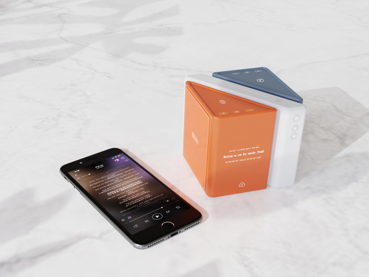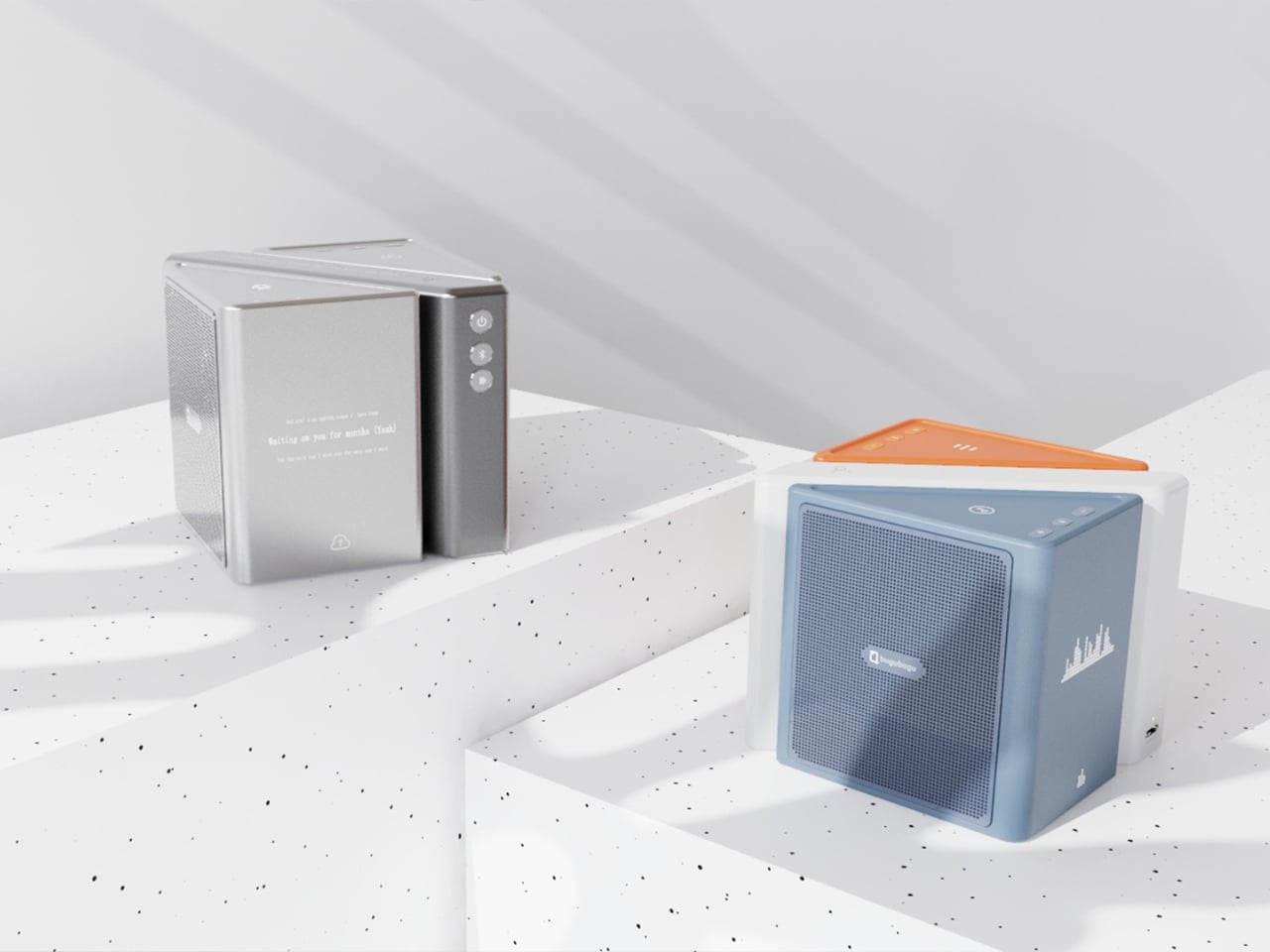 The color language is considered too. The renders show options in slate blue, orange-coral, silver metallic, and white-grey, each colorway with its own character but all sharing the same graphic vocabulary: pixel waveform icons and quiet typography showing floating lyrics directly on the module surface. It reads like something between a well-designed toy and a serious piece of consumer electronics, which is an interesting space for a speaker to occupy.