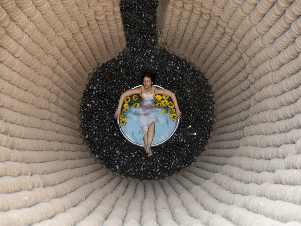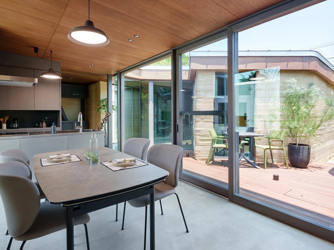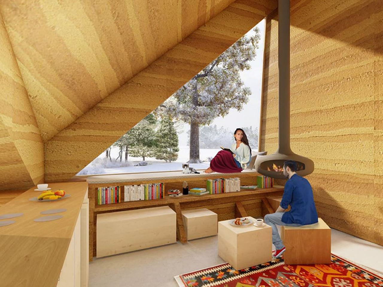 Casa Covida is a modern reinterpretation of ancient building methods that merges traditional materials like mud, clay, and straw with advanced 3D-printing technology. Developed by Emerging Objects, the project showcases how earth-based architecture, used by nearly 30% of the global population, can be revived for contemporary living. Built in Colorado’s San Luis Valley using a SCARA robotic printer, the structure is made from an adobe blend and features three interconnected zones: a central space with a hearth, a sleeping area furnished with reclaimed beetle kill pine, and a bathing zone with a river-stone-embedded tub. An inflatable cactus-inspired roof adds weather protection and visual intrigue.