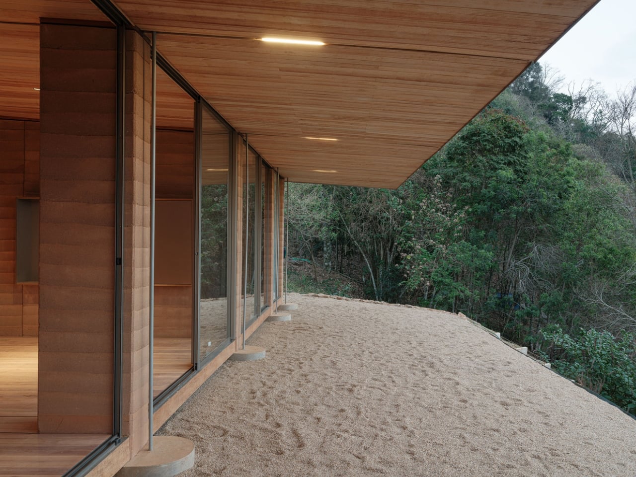 Inside, the design balances minimalism and warmth, with natural light accentuating the earth walls’ varied textures. Embedded sensors monitor moisture and structural performance discreetly, improving long-term sustainability. The flat roof accommodates future solar or water systems, highlighting a practical integration of eco-friendly features.