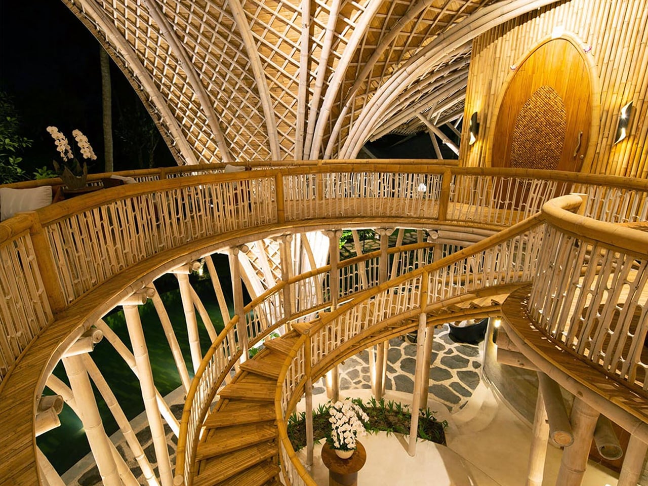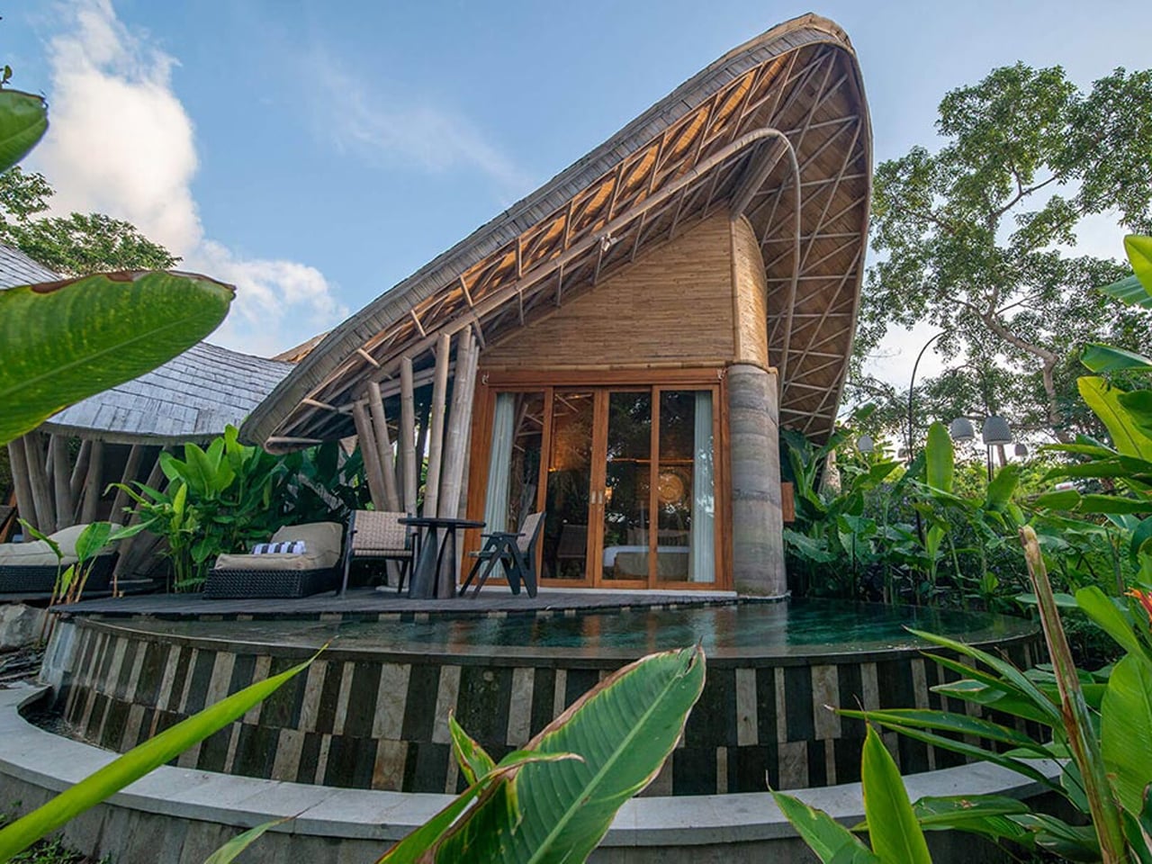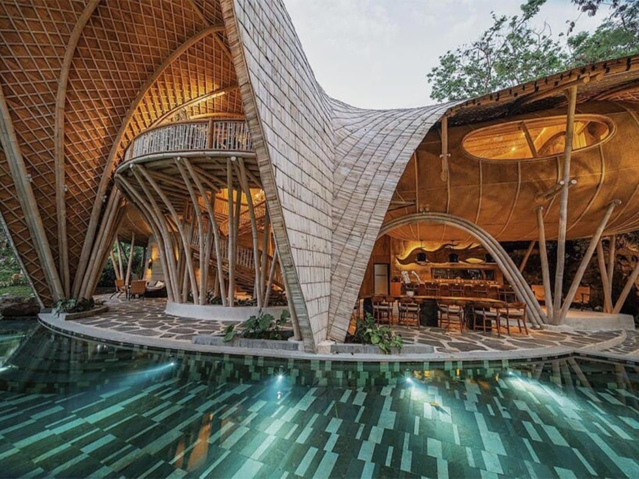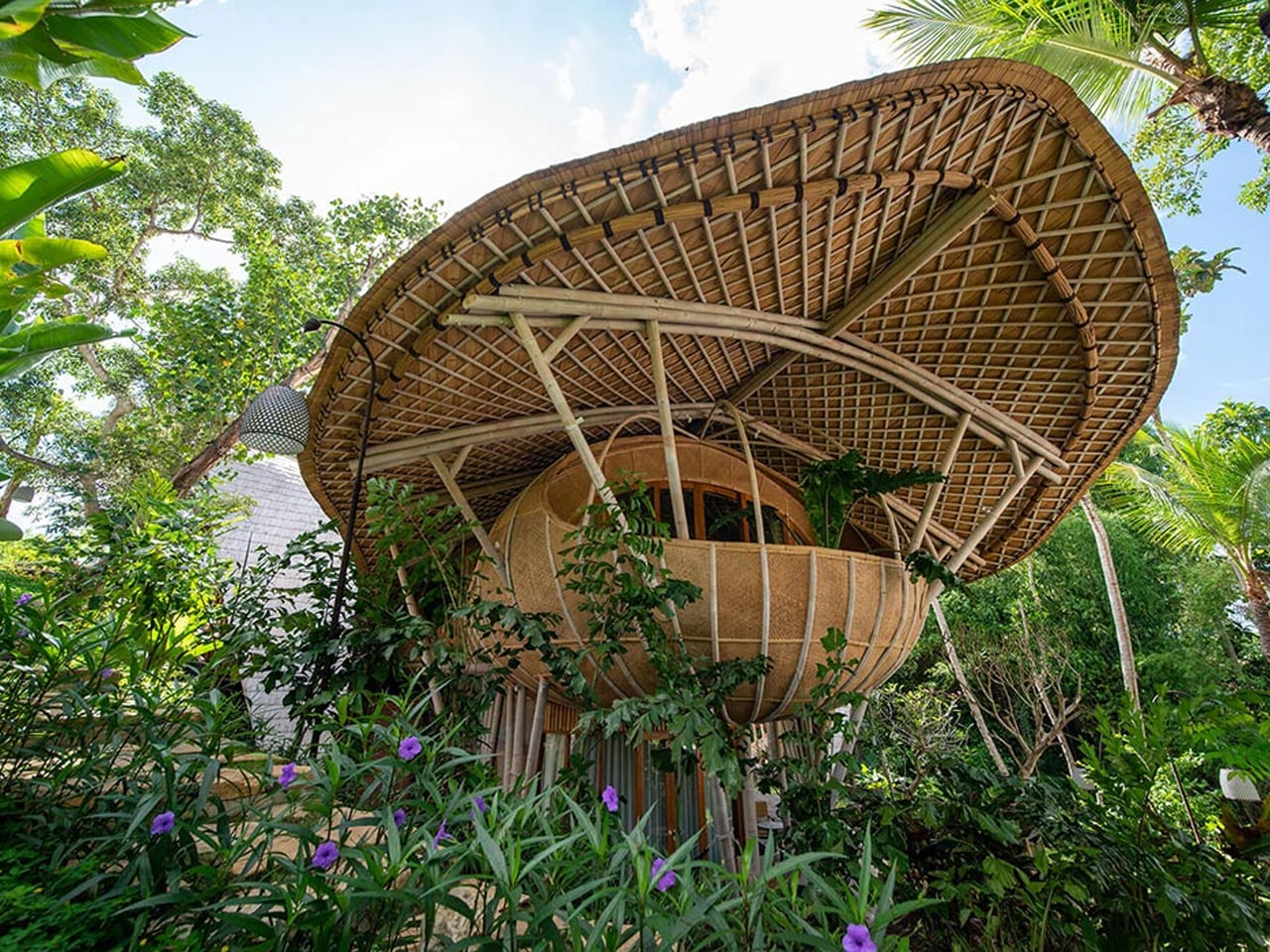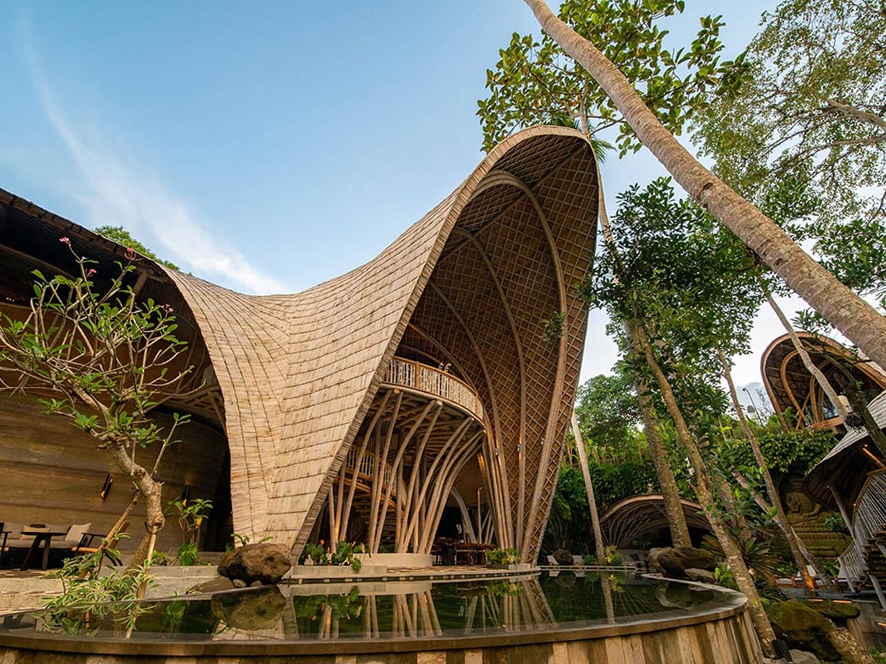 Situated in Kaba-Kaba village, the resort showcases the structural and aesthetic potential of sustainable materials. Rammed earth, used for the ground-level walls, offers a low-emission alternative to concrete, while the curvilinear bamboo roofing blends cultural authenticity with structural beauty. Powered by hydroelectric energy from a nearby river, the resort includes a cliffside yoga studio and a meandering pool designed to reflect natural surroundings.