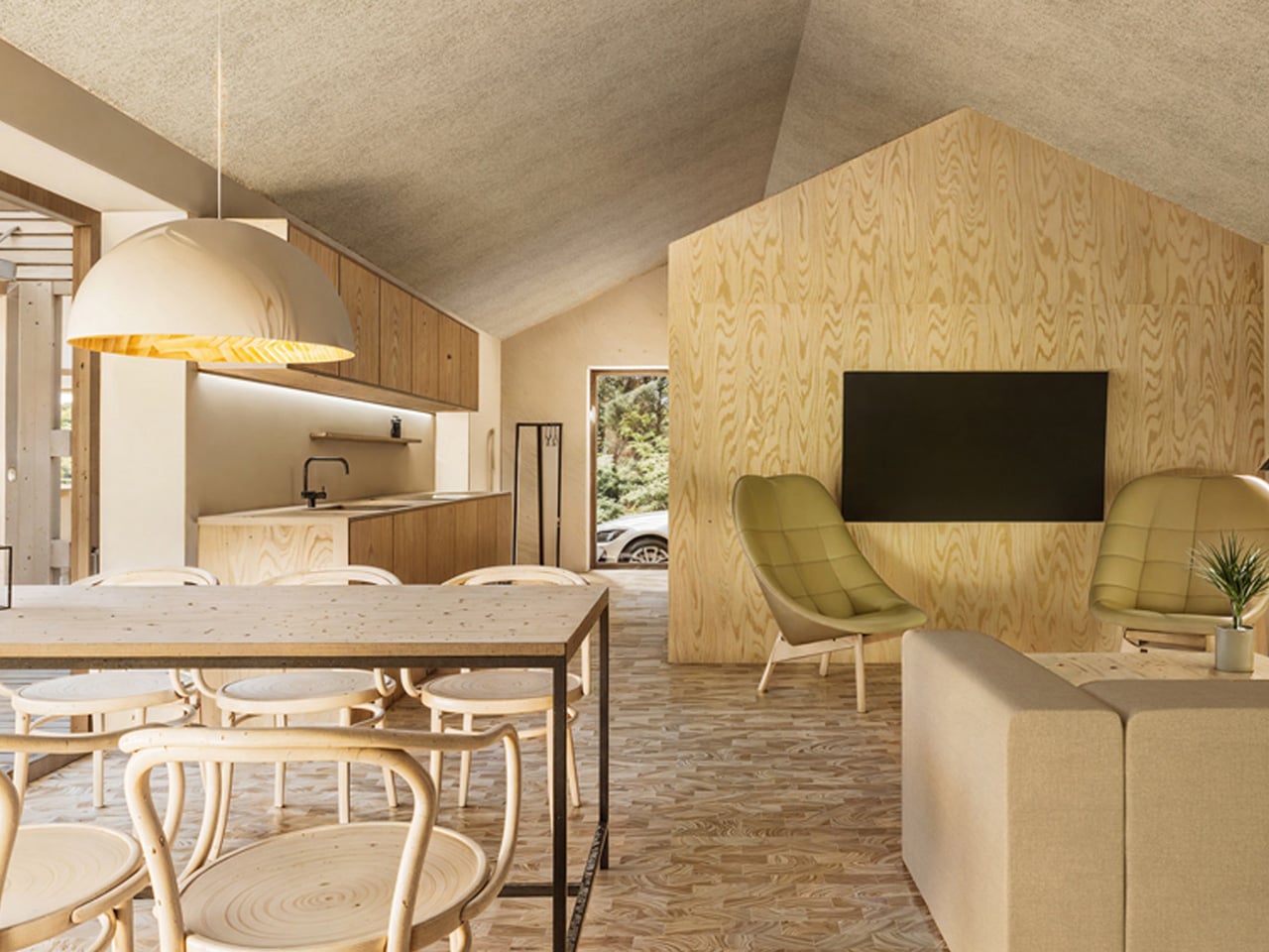 The concept is straightforward but radical. Rebound cultivates the fast-growing root structure of fungi inside a mould, producing a rigid, lightweight panel with natural sound-absorbing qualities. That mycelium core is then enclosed within a timber frame built from reclaimed and surplus wood, including offcuts sourced from Danish flooring manufacturer Dinesen, meaning the door carries minimal material waste from start to finish.